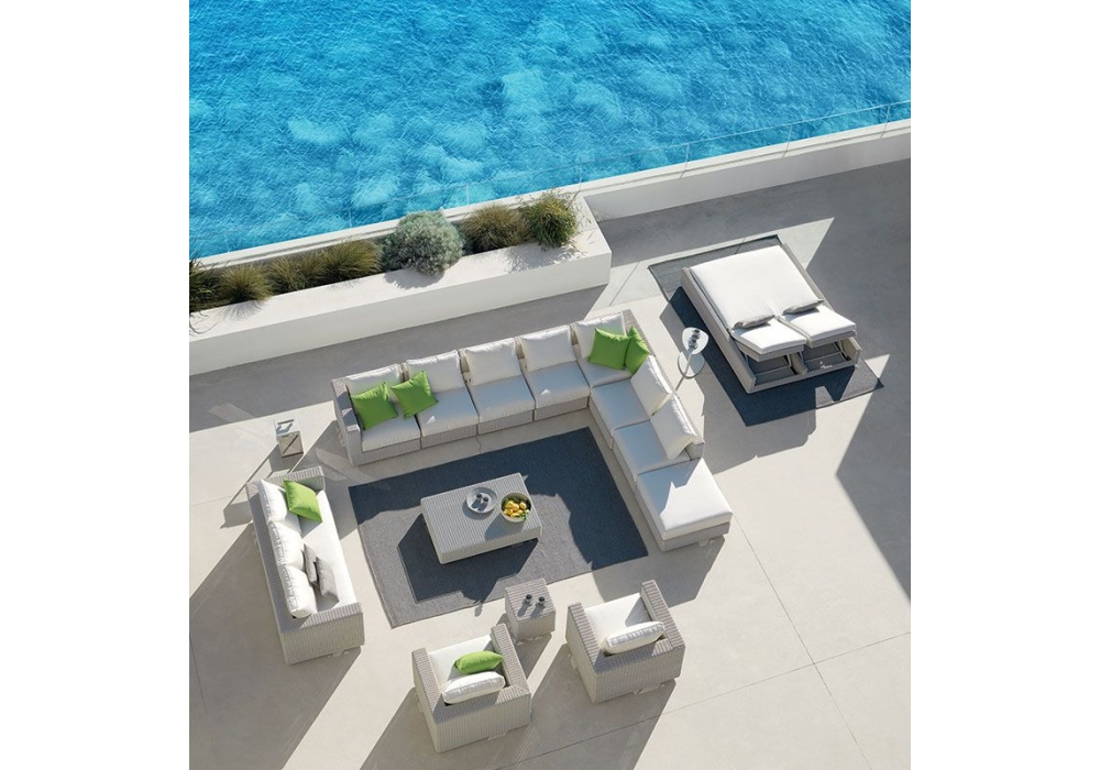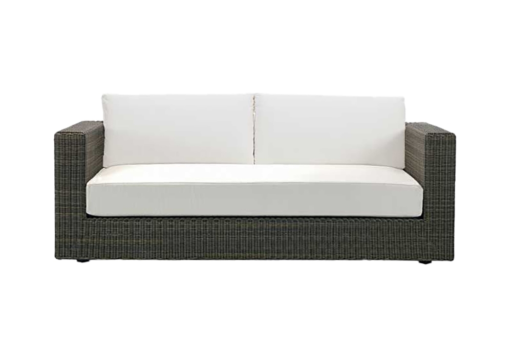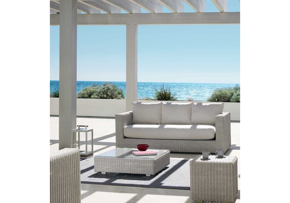 Cube, produziert und signiert von Ethimo, ist ein Dreisitzer-Sofa in Etwick mit Kissen, die mit elfenbeinfarbenem und taubengrauem Acryl bezogen sind.