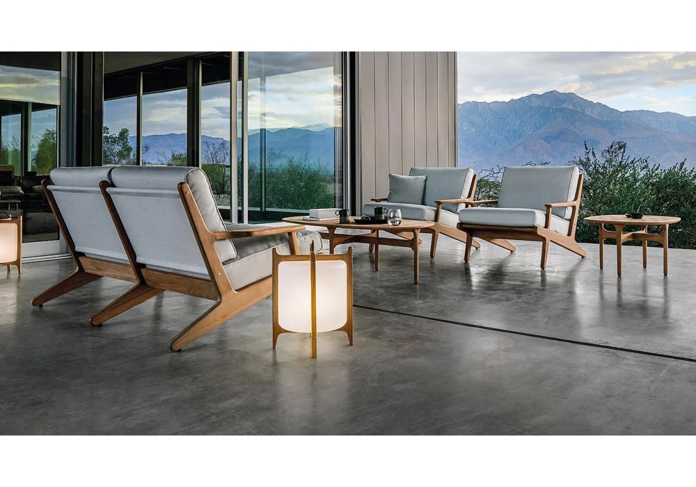 Bay, von Henrik Pedersen für Gloster entworfen, ist ein Outdoor-Sofa aus Teakholzrahmen mit Sling-Sitz und -Rückenlehne und mit Outdoor-Stoff bezogenen Kissen.