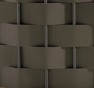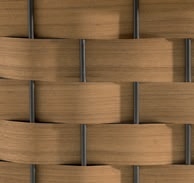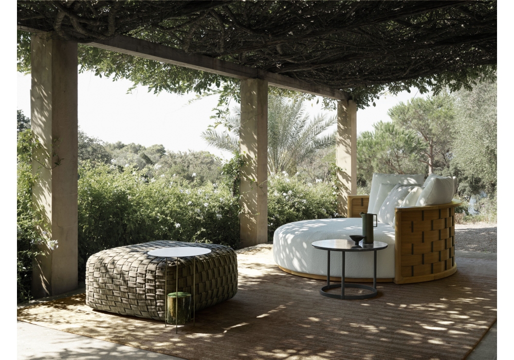 Palinfrasca von Vincent Van Duysen für Molteni&C entworfen, ist ein Love Seat mit massiver Teakholzstruktur, Schale mit verschlungenen Bändern aus Teakholz oder aus olivgrünem Polyurethan-EVA. Polsterung aus Polyurethan und Stoffbezug.