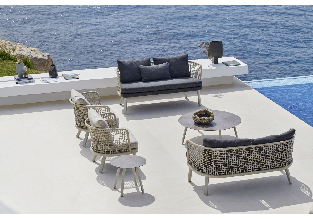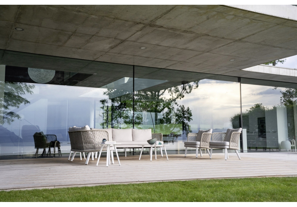 Emma von Monica Armani für Varaschin entworfen, ist ein Outdoor-Sofa mit Beinen aus Aluminium oder massivem Iroko. Sitz mit Stoff bezogen, Sitzstruktur aus Polypropylen. Rückenlehnen mit verflochtenen pulverbeschichteten Aluminiumrahmen oder aus Sperrholz für den Außenbereich und mit Stoff bezogen. Erhältlich in verschiedenen Ausführungen und in zwei Größen.