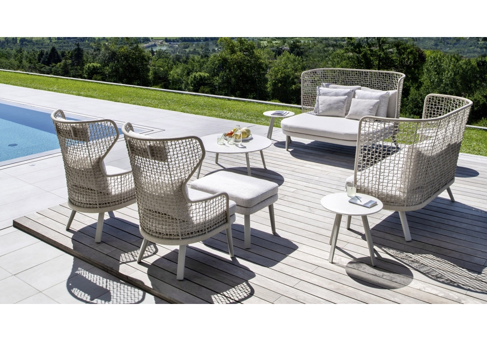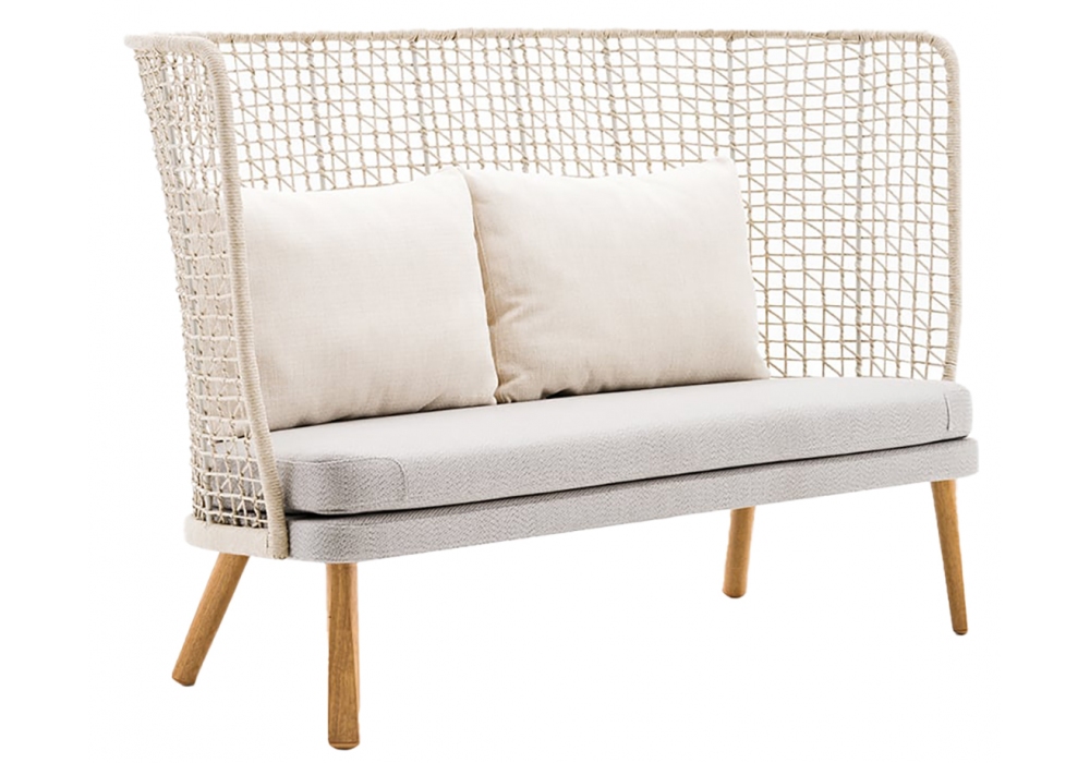 Emma von Monica Armani für Varaschin entworfen, ist ein Outdoor-Sofa mit hoher Rückenlehne und Beinen aus Aluminium oder massivem Iroko. Sitz mit Stoff bezogen, Sitzstruktur aus Polypropylen. Rückenlehnen mit verflochtenen pulverbeschichteten Aluminiumrahmen oder aus Sperrholz für den Außenbereich und mit Stoff bezogen. Erhältlich in verschiedenen Ausführungen.