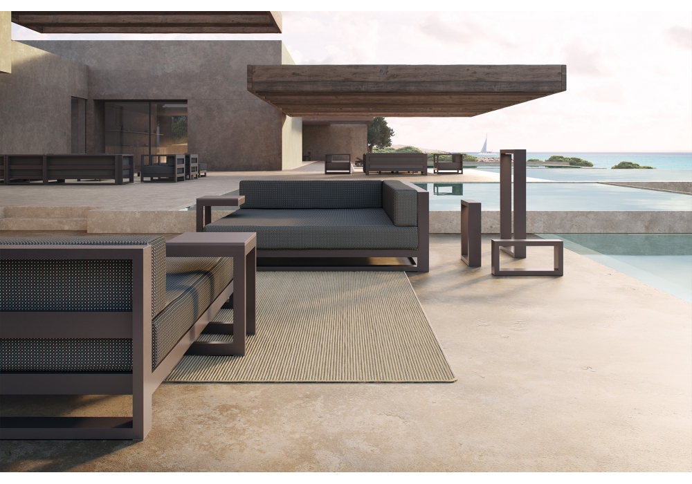 Posidonia von Ramón Esteve für Vondom entworfen, ist ein Sofa mit Aluminiumstruktur und gepolsterten Kissen mit Stoffbezug.