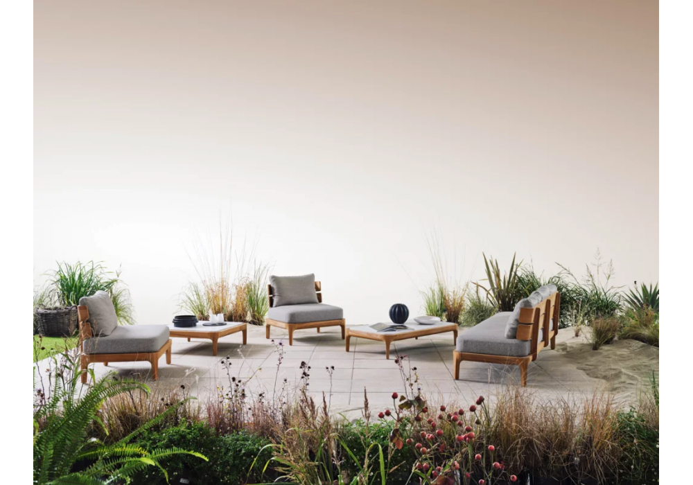 Mediterraneo von Francesco Meda für Gervasoni entworfen, ist ein Dreisitzer-Sofa mit Teakholzstruktur und abnehmbarem Stoffbezug.