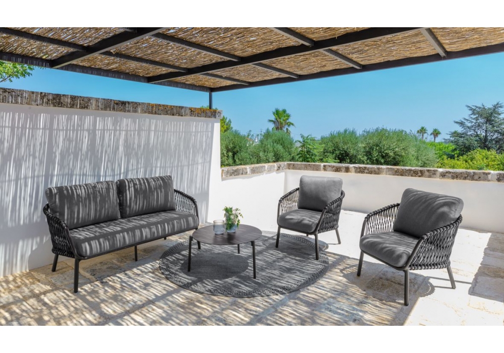 Abel von Talenti entworfen, ist ein Sofa mit pulverbeschichteter Aluminiumstruktur und Stoffbezug. Erhältlich in verschiedenen Ausführungen.