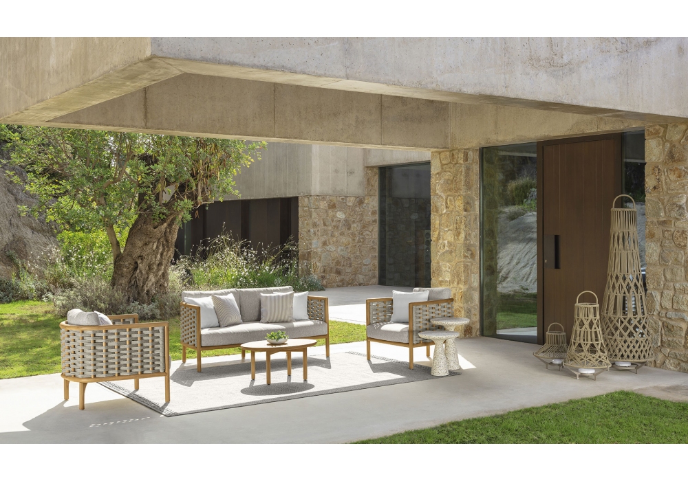 Prichi von Talenti entworfen, ist ein Sofa aus Holz, Seiten mit synthetischem Seilgeflecht, gepolsterter Sitz und Rückenlehne mit Stoffbezug.