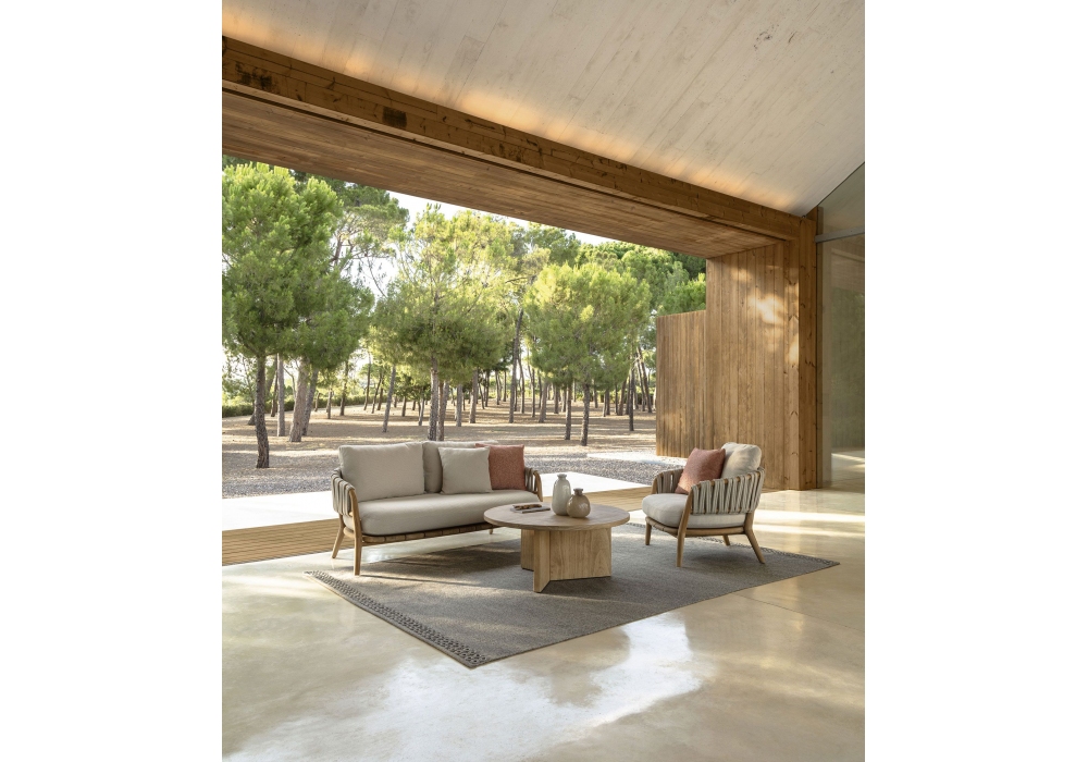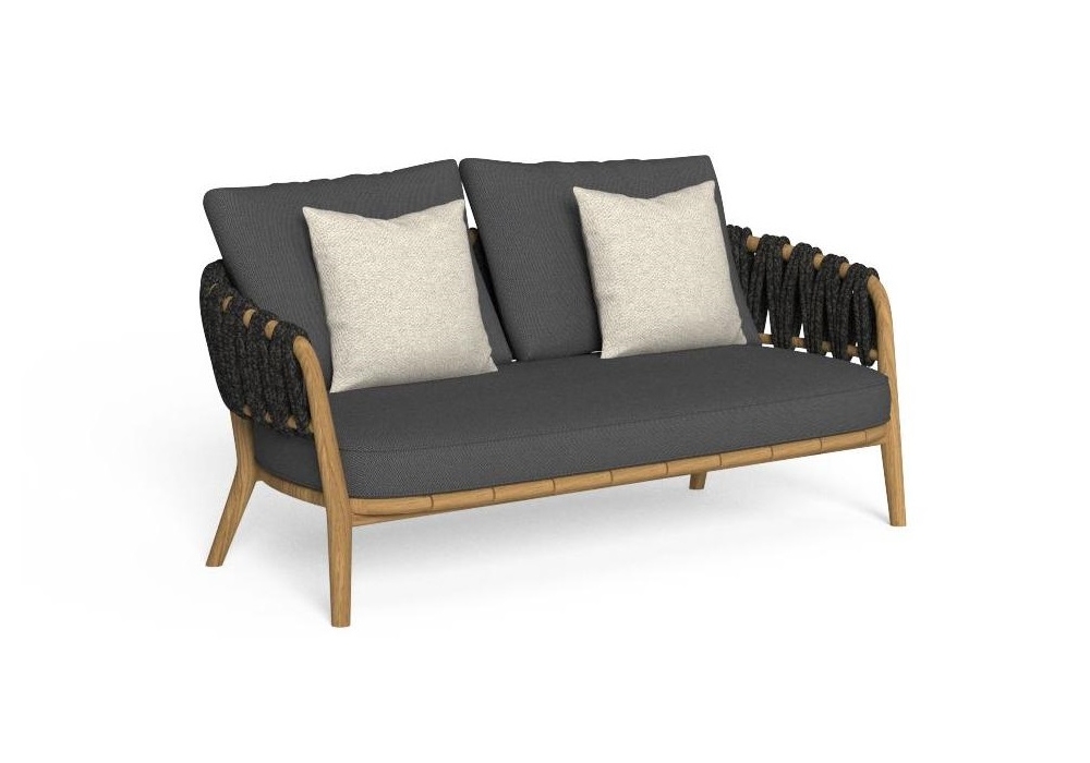 Venice von Ludovica + Roberto Palomba für Talenti entworfen, ist ein kleines Sofa aus Holz, gepolsterter Sitz und Rückenlehne mit Stoffbezug.