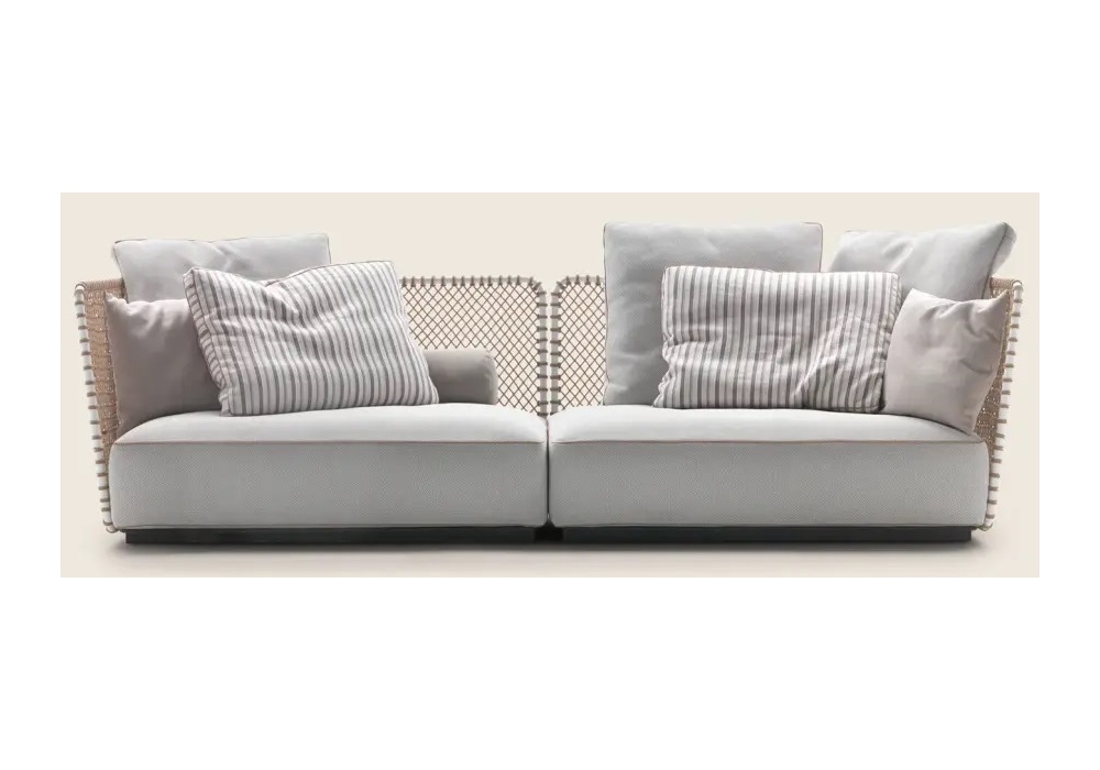 Oasis von Antonio Citterio für Flexform entworfen, ist ein modulares Outdoor-Sofa mit einer Struktur aus mit Epoxidpulver lackiertem Edelstahlrohr. PVC- oder Kordelgeflecht, verfügbar in verschiedenen Ausführungen. Sockel aus schwarz lackiertem Edelstahl und geschichteter Kompaktlaminatplatte. Abnehmbare Polsterung in verschiedenen Stoffen. Mit seinen geschwungenen und umhüllenden Linien ermöglicht Ihnen das Oasis-Sitzsystem die Gestaltung von Einrichtungslösungen für Außenbereiche, die eine intime und intime Atmosphäre hervorrufen.