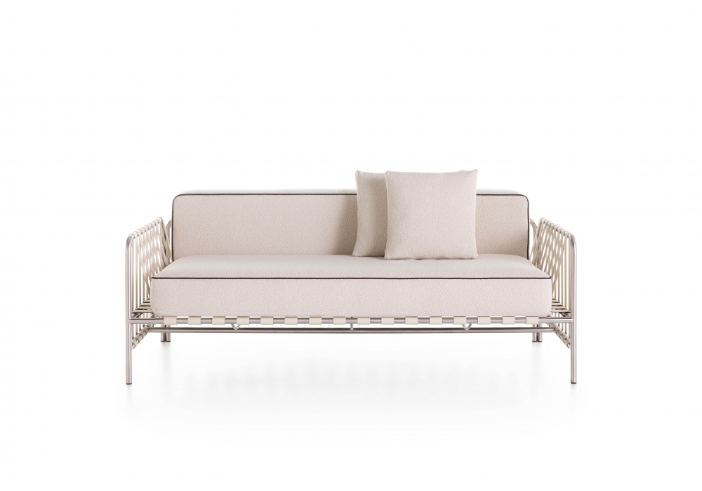 Onsen von Francesco Meda und David Quincoces für Gandia Blasco entworfen, ist ein Designer-Zweisitzer-Sofa mit einer Struktur aus satiniertem Edelstahlrohr ohne künstliche Oberflächenbehandlung, pulverbeschichtetem Aluminium und Gurten aus Kunstleder, Vinyl und Polyester. Sitz, Rückenlehne und Kissen aus Polyurethan-Gummi und Polyesterfaser mit wasserabweisendem Bezug. Erhältlich in verschiedenen Ausführungen.