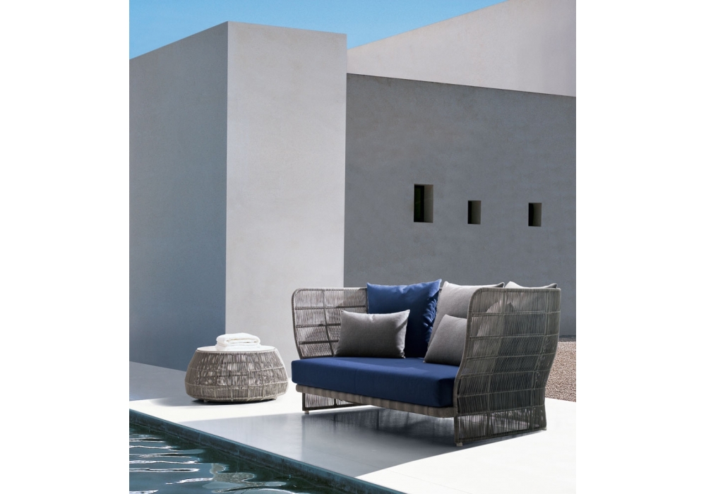 Canasta'13, von Patricia Urquiola für B&B Italia Outdoor entworfen, ist ein Sofa mit Gestell aus Tortora-Polyester-Aluminiumpulver und Interlacing aus Tortora-Polyethylen. Sitzkissen aus geformtem Polyurethan und Rückenkissen aus Polyesterfaser, Bezug aus wasserabweisender Polyesterfaser. Aderendhülsen aus thermoplastischem Material. Stoffbezug.