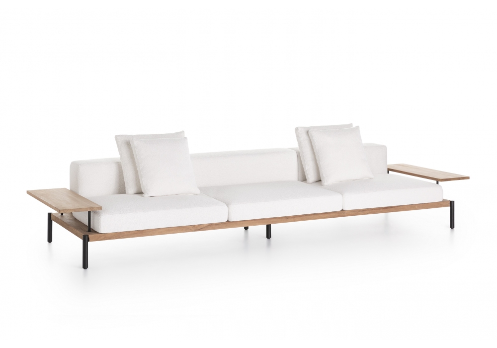 Lademadera von Francesco Meda und David Quincoces für Gandia Blasco entworfen, ist ein Designer-Sofa aus Teakholz aus nachhaltiger Forstwirtschaft und einer 100% recycelbaren, pulverbeschichteten Aluminiumstruktur. Sitz und Rückenlehne aus Polyurethanschaum und Polyesterfaser mit wasserabweisendem Bezug. Verfügbar in verschiedenen Ausführungen und Größen.
