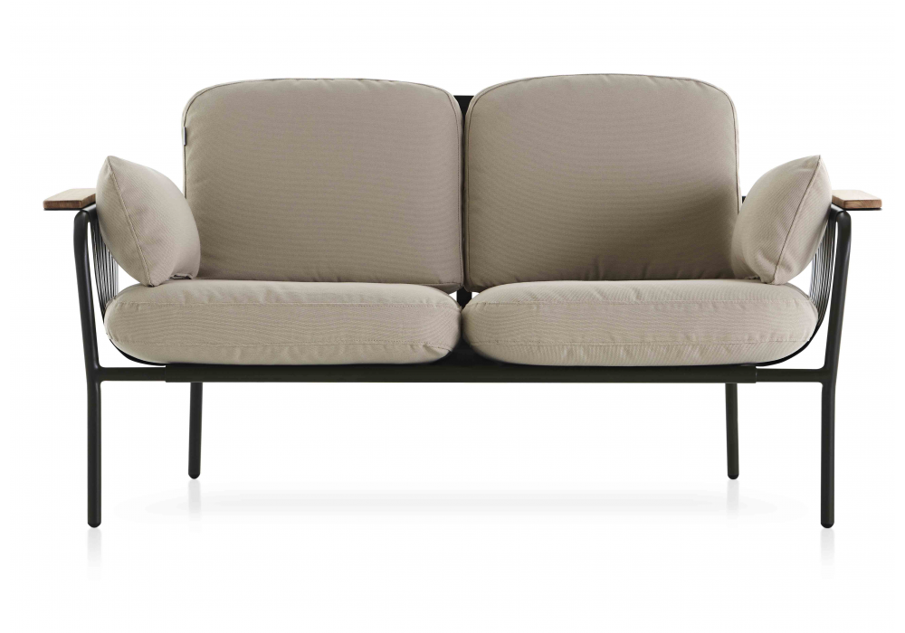 Capa von Søren Rose für Gandia Blasco entworfen, ist ein Designer-Zweisitzer-Sofa aus pulverbeschichtetem Aluminium. Armlehnen aus Porzellan (optional) oder Iroko-Holz. Sitz und Rückenlehne aus Polyurethanschaum und Polyesterfaser mit wasserabweisendem Bezug. Kissen aus Polyesterfaser mit wasserabweisendem Bezug. Verfügbar in verschiedenen Ausführungen.