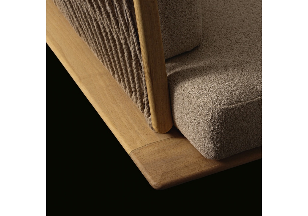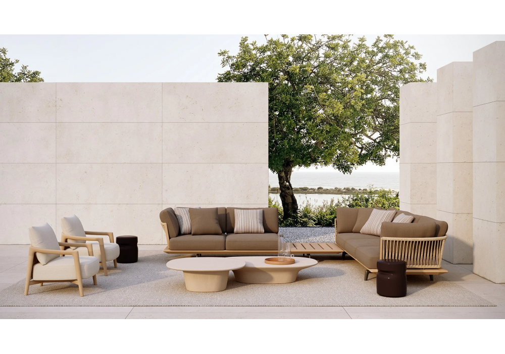 Lagoon von Emmanuel Gallina für Poliform entworfen, ist ein Sofa mit einem Gestell aus massivem Teakholz und Füßen aus geprägtem, lackiertem Aluminium in Oxidfarbe. Rückenlehne aus Edelstahlrohr, bezogen mit Seil in Ziegel- und Dunkelbrauntönen oder mit natur gedrehtem Seil. Kissen aus recyceltem Polyester PET mit Einsätzen aus Polyurethan mit unterschiedlicher Dichte. Abnehmbarer Stoffbezug.