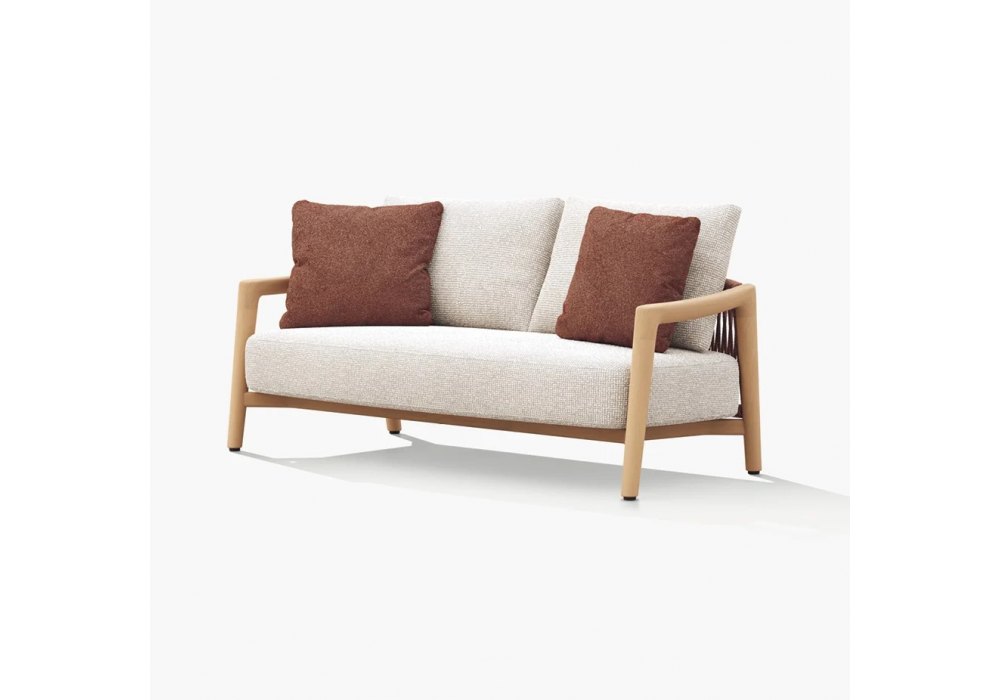 Ponte von Emmanuel Gallina für Poliform entworfen ist ein Sofa mit einer Struktur aus massivem Teakholz und einer Rückenlehne aus lackiertem Edelstahlrohr, geflochten mit Seil in Ziegel-, Dunkelbraun- oder Naturtönen. Sitz- und Rückenkissen aus recyceltem PET-Polyester mit Polyurethan-Einlage, bezogen mit abnehmbarem Stoff. Optionales Kissen erhältlich.