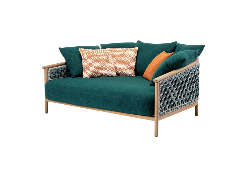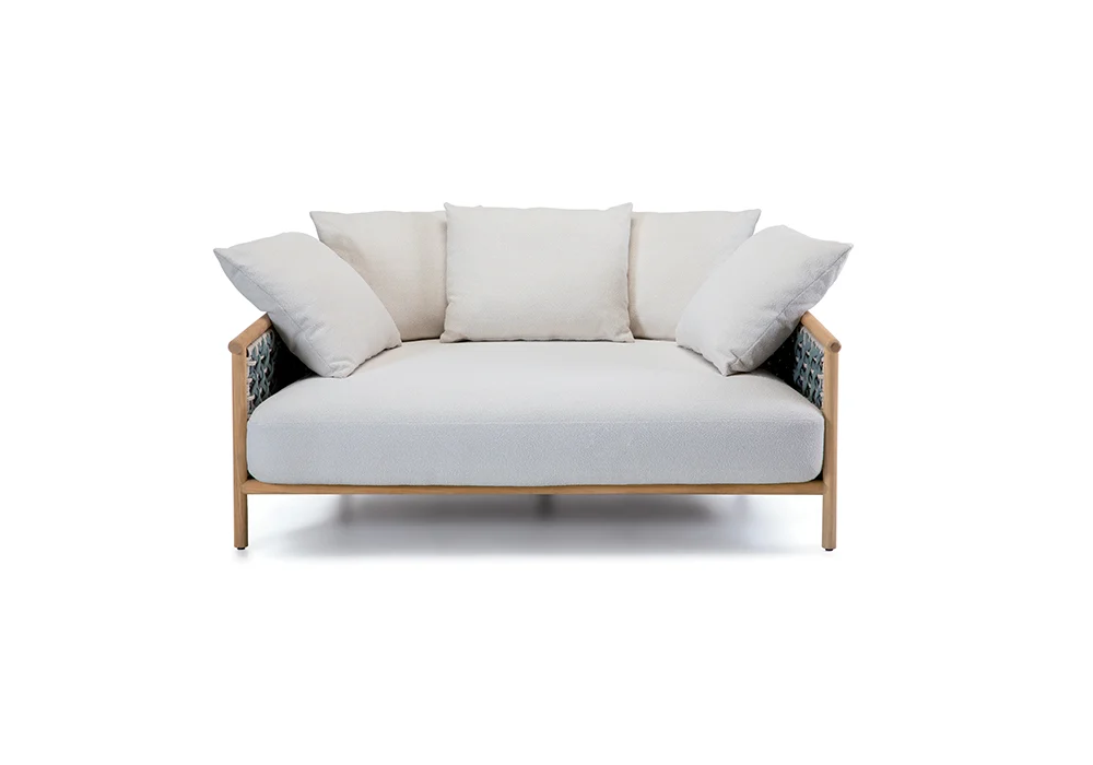 Patio von Zanellato / Bortotto für Ethimo entworfen, ist ein Daybed mit einer Struktur aus natürlichem Teakholz und einer Rückenlehne mit gewebtem Stoff. Sitz- und Rückenkissen aus Polypropylen.