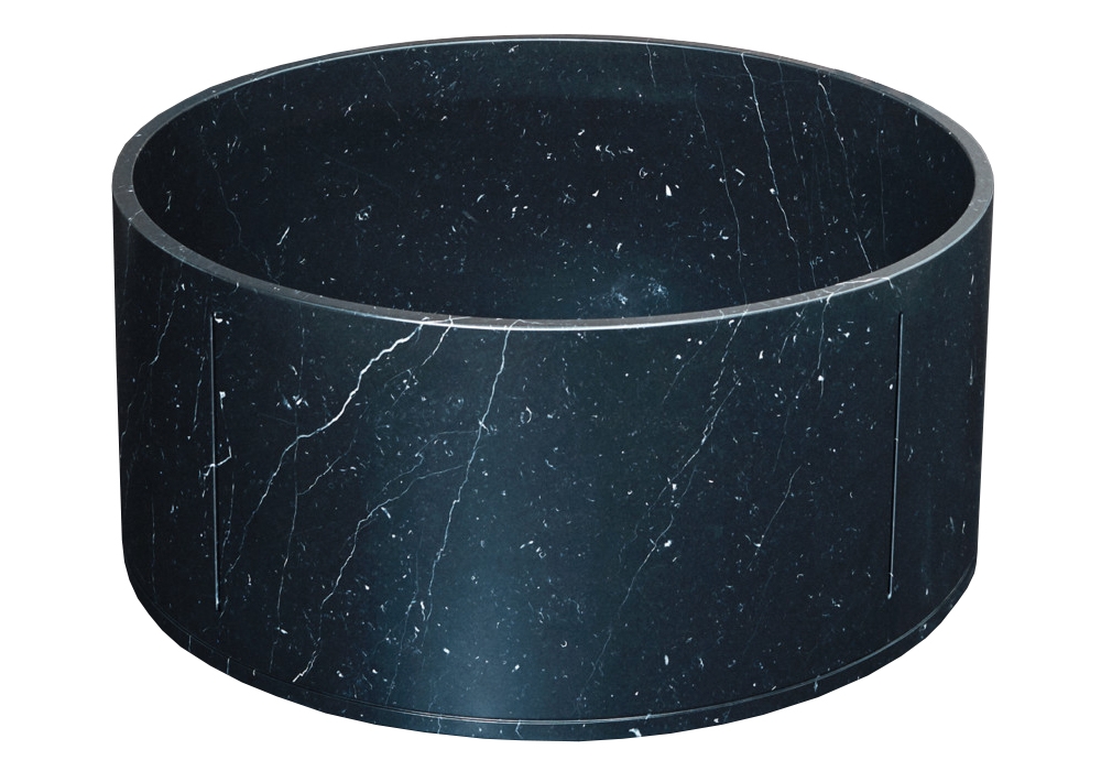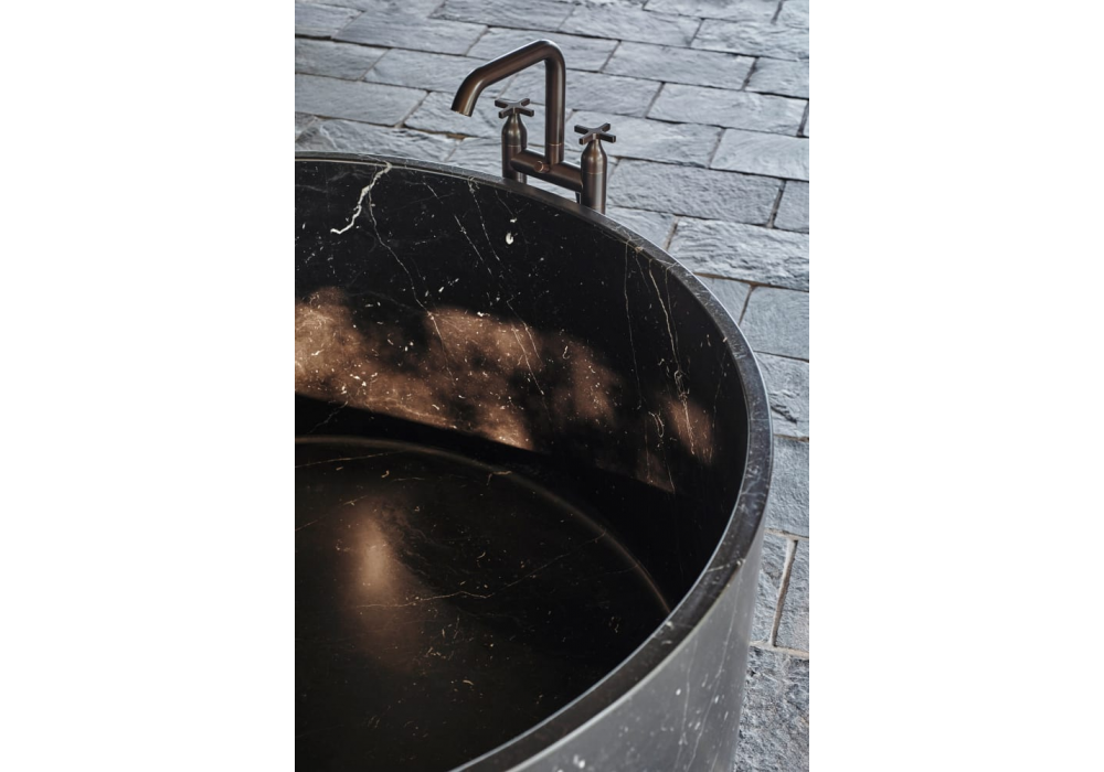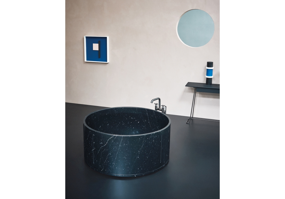 In-Out von Benedini Associati für Agape entworfen, ist eine Badewanne mit rundem Becken aus Marmor in verschiedenen Ausführungen. Sie verfügt über einen verchromten Siphon mit integriertem Überlauf. Die Armaturen können an der Wand oder auf dem Boden angebracht werden.