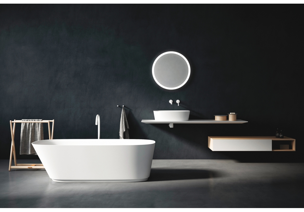 Neb von Benedini Associati für Agape entworfen, ist eine Badewanne aus Cristalplant® biobased in verschiedenen Ausführungen, ohne Hahnloch, mit freiem Abfluss. Komplett mit Siphon-Abfluss.
