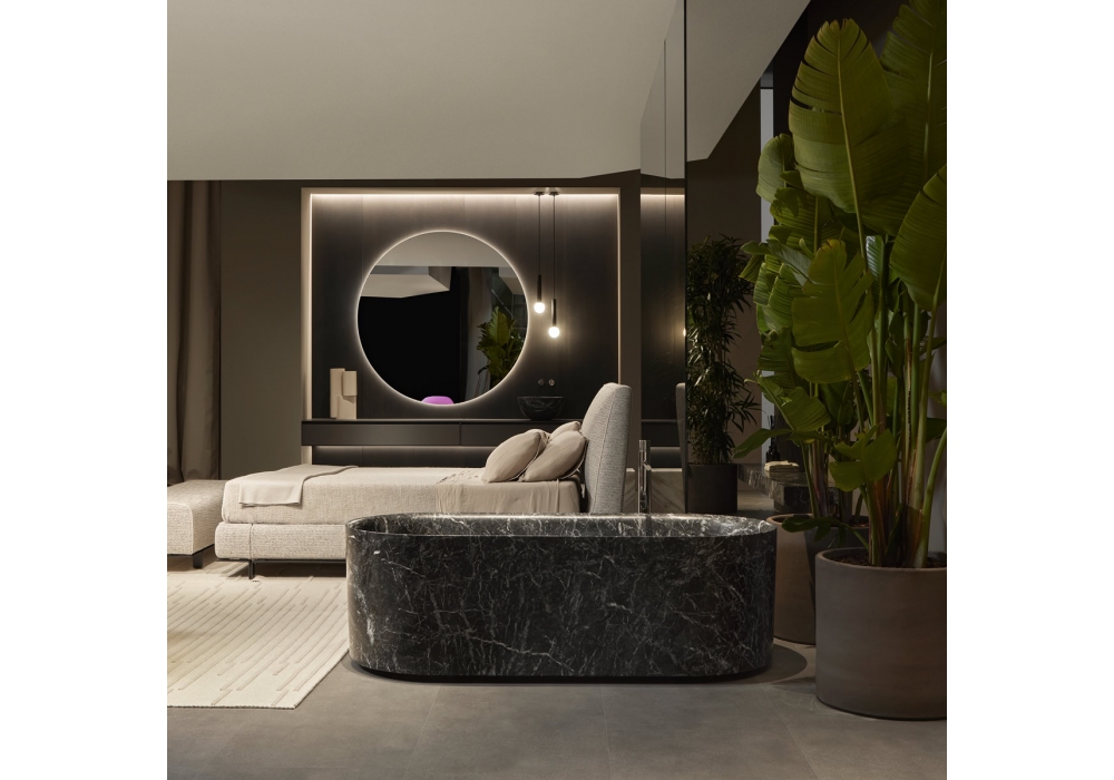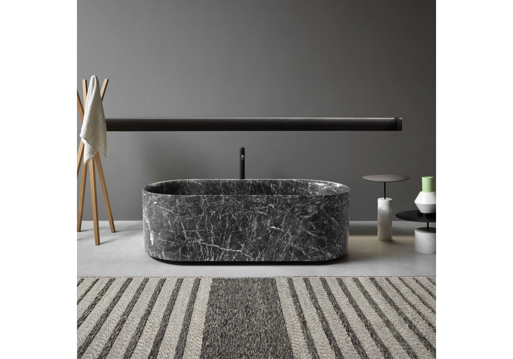 Nebula von Antonio Lupi entworfen, ist eine ovale Steinbadewanne, komplett mit einem Abfluss mit Klick-Klack-Druckablasssystem und einem Marmorstöpsel.