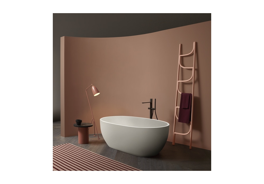 Reflexlight von Antonio Lupi entworfen, ist eine ovale Badewanne aus Flumood, außen lackierbar, aus Colormood, innen und außen lackierbar, komplett mit Abfluss mit unsichtbarem automatischen Überlauf, Siphon und flexiblem Schlauch.
