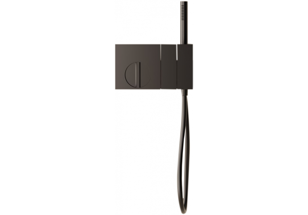 Sen von Gwenael Nicolas, Curiosity für Agape ist ein Zweiwege-Thermostathahn zur Wandmontage aus gebürstetem, eloxiertem Aluminium mit schwarzer Oberfläche und unabhängiger Steuerung. Handbrause und flexibler Schlauch inklusive.