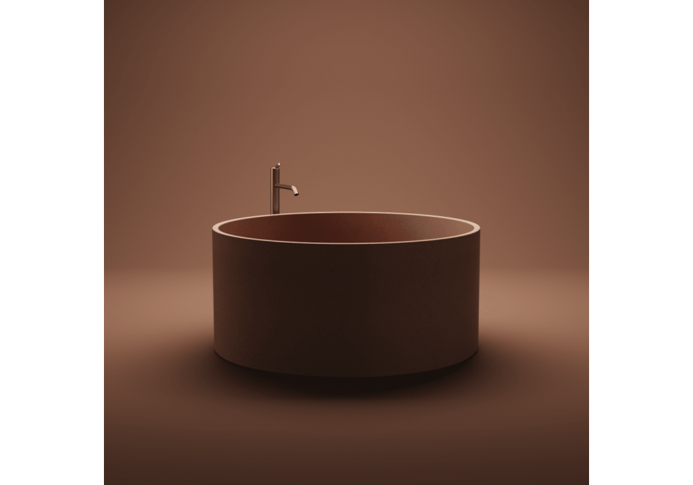 In-Out von Benedini Associati für Agape entworfen, ist eine Badewanne aus Beton für den Außenbereich mit runder Basis aus Cementoskin in verschiedenen Ausführungen. Überlauf in verchromtem Ablauf integriert. Es gibt keine Hahnlöcher.