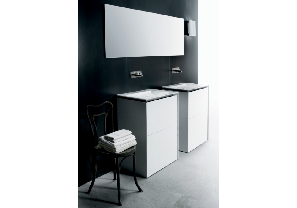 B15, entworfen von Robert Wangen, ist ein Monoblock-Sockel mit Bodenstütze und doppelt ausziehbarer Schublade. Das Waschbecken ist in die Platte integriert Die Platte mit integriertem Waschbecken kann aus weißem Carrara- oder schwarzem Marquinia-Marmor (mit Schulter rechts oder links) oder aus Cristalplant® (mit Schulter nur rechts) hergestellt werden. Erhältlich ist in beiden Fällen die Spüle mit platzsparendem Siphon. Wenden Sie sich an unseren Kundendienst, um Ihr Gerät zu entwerfen.