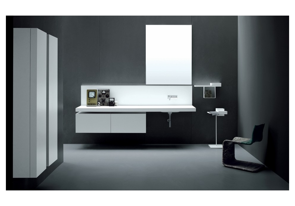 Flyer, entworfen von Monica Armani, ist ein Arbeitsplatten- und Aufbewahrungssystem, das in mehrere Elemente unterteilt ist: die Waschtischplatte mit integrierter Aufkantung und Beleuchtung, die hängenden Unterschränke mit Schubladen, die Hochschränke mit Flügeltüren. Erhältlich in verschiedenen Ausführungen. Wenden Sie sich an unseren Kundendienst, um Ihr Gerät zu entwerfen.