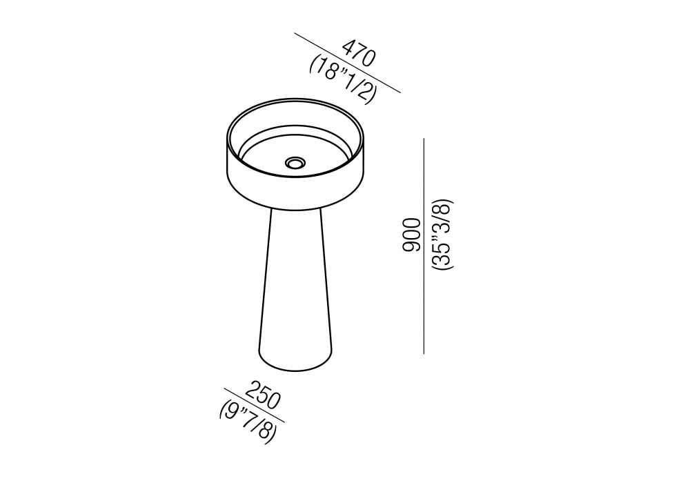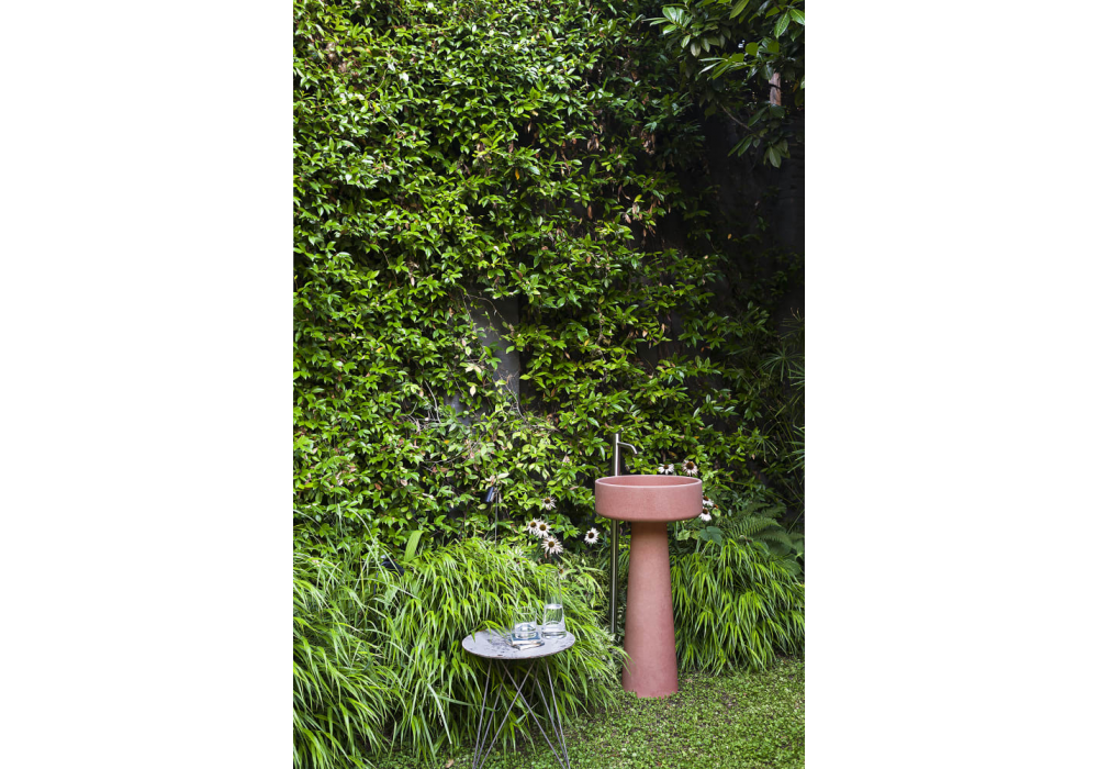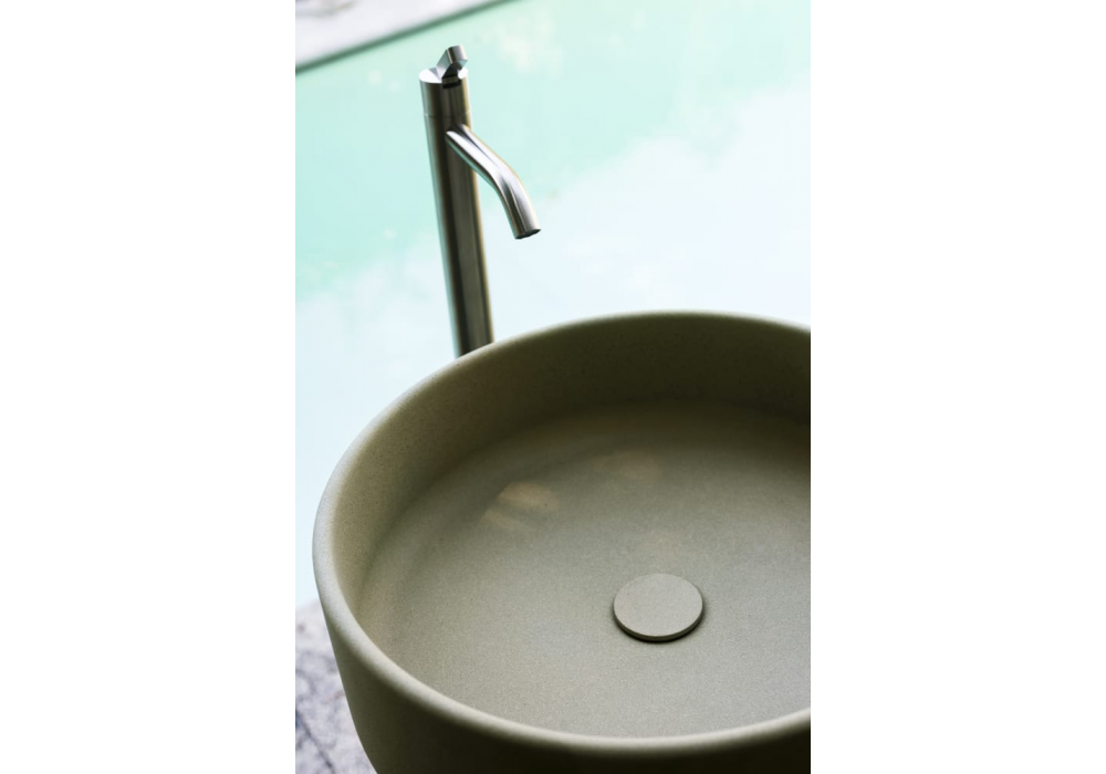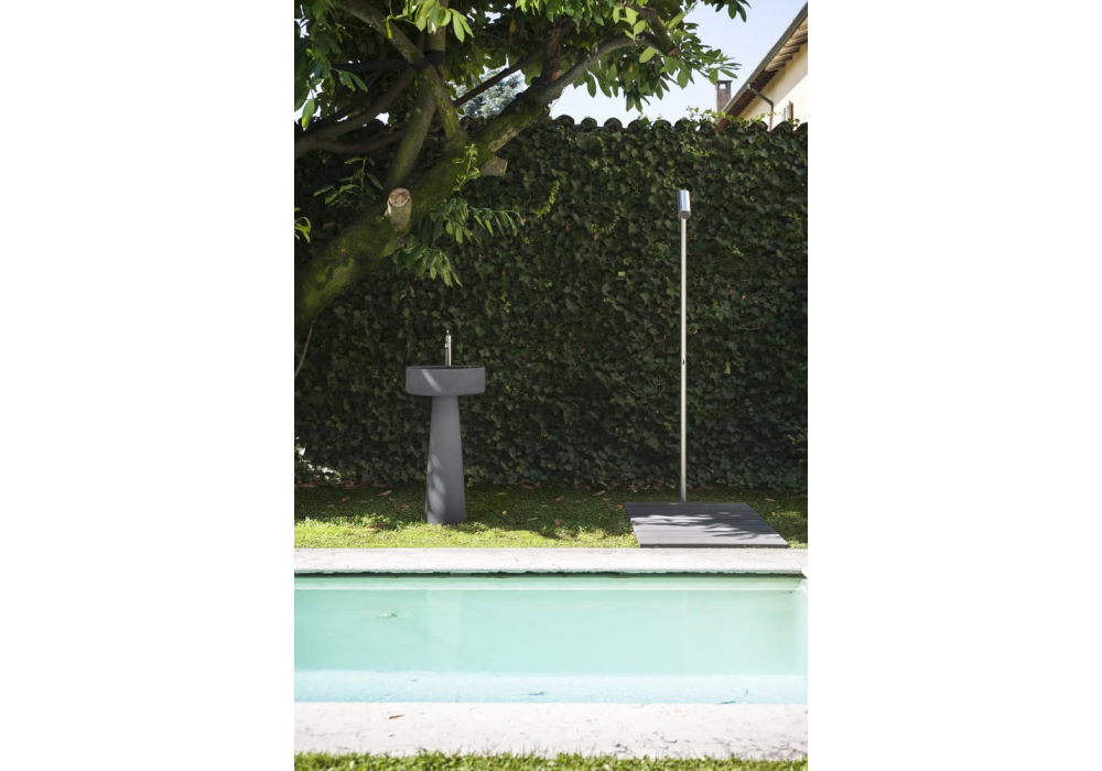 Bjhon 1 Outdoor von Angelo Mangiarotti für Agape entworfen, ist ein Standwaschbecken aus Petit Granit-Marmor oder Cementoskin® in verschiedenen Ausführungen. Es zeichnet sich durch ein zylindrisches Becken und eine Bodenstütze aus. Es gibt kein Hahnloch; freier Abfluss. Verfügbar in der Version mit Wand- oder Bodenablauf.
