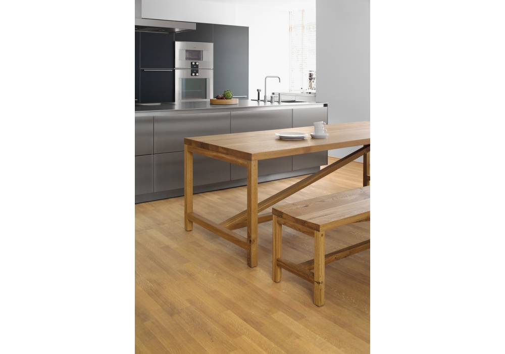 BE05 Sitz designed by Jörg Schellmann for E15 is a bench realized in solid wood. The signature diagonal bar dominates the character of the solid wood bench, highlighting the casual and stable construction. Available in oak and in seven lenghts.