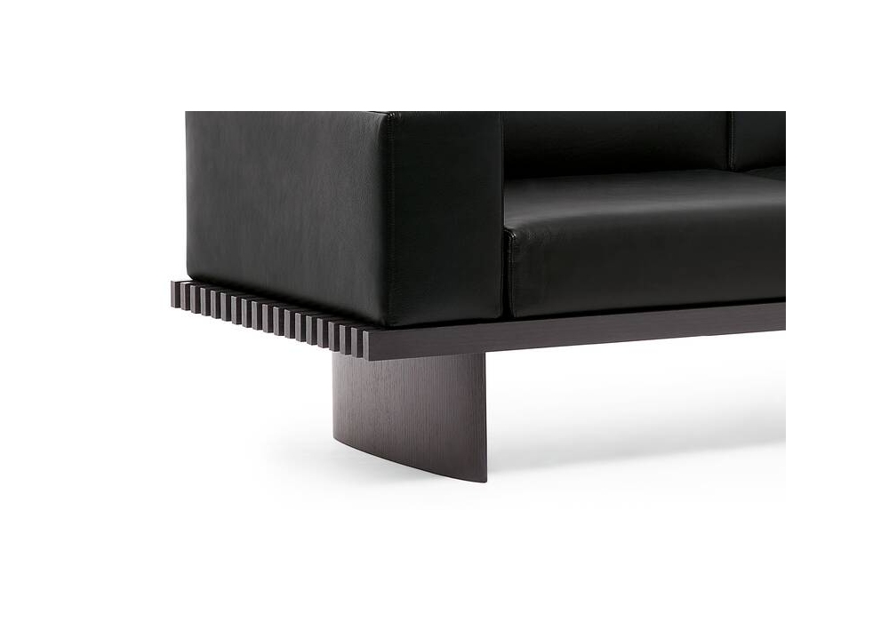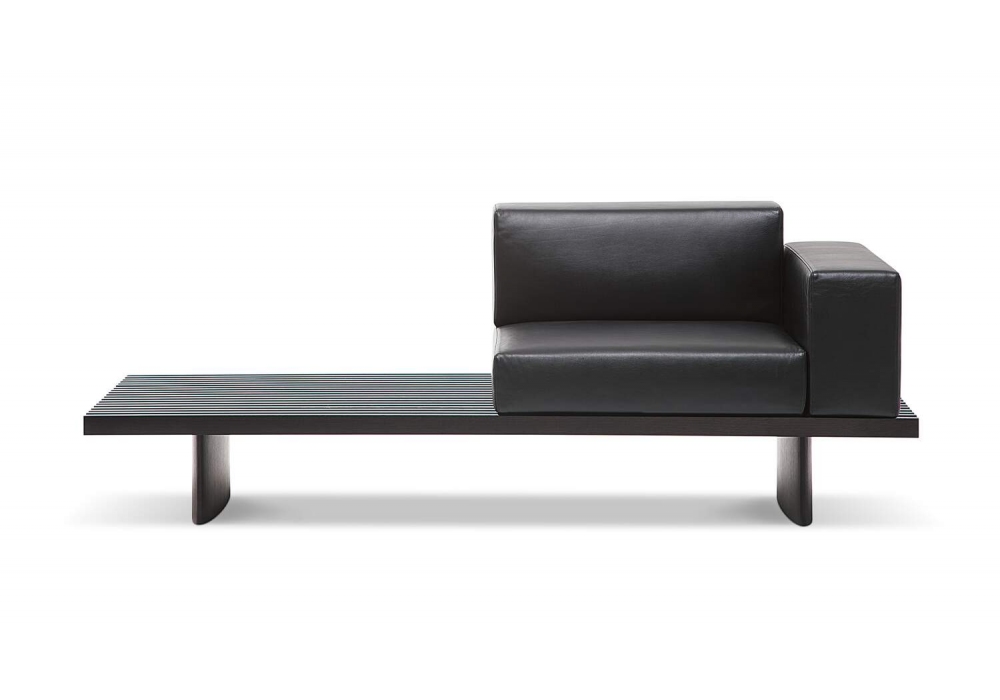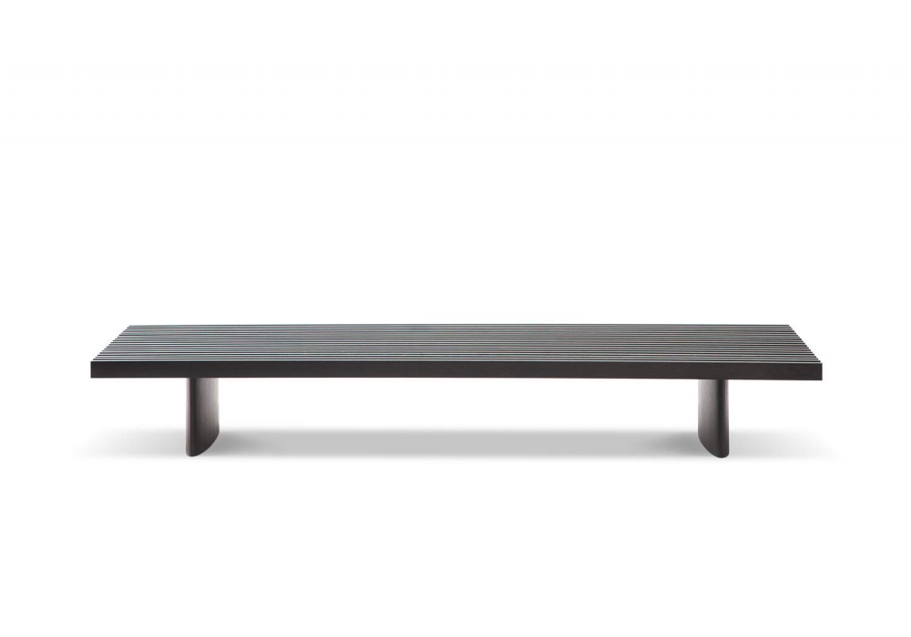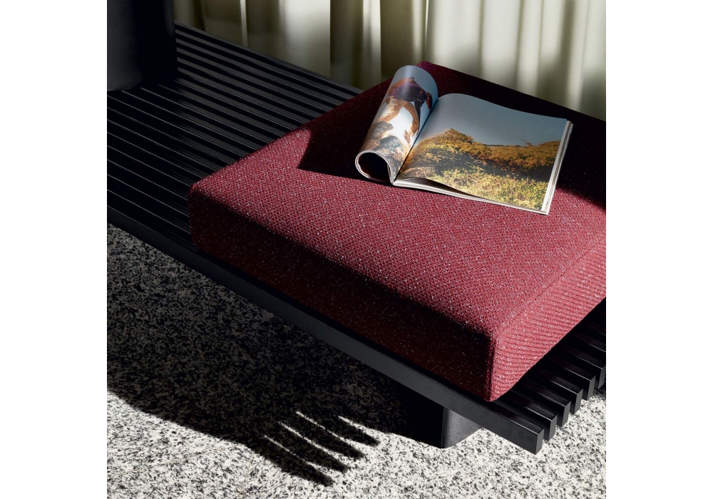 514 Refolo von Charlotte Perriand für Cassina ist eine Modulsystem kann als Beistelltisch, Bank oder durch Auflegen von Kissen auch als Polstermöbel genutzt werden. Das Gestell ist in Eiche natur oder dunkel gebeizt erhältlich. Die Oberfläche besteht aus neunzehn Leisten. Die Kissen aus Polyurethan und Polyesterwatte sind: Armlehne, Sitz und ein Satz zwei zusammenpassender Kissen: ein Sitzkissen und ein Rückenkissen. Die Kissen werden mit einem einfachen Befestigungssystem am Gestell fixiert.