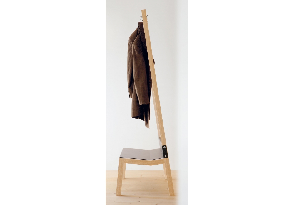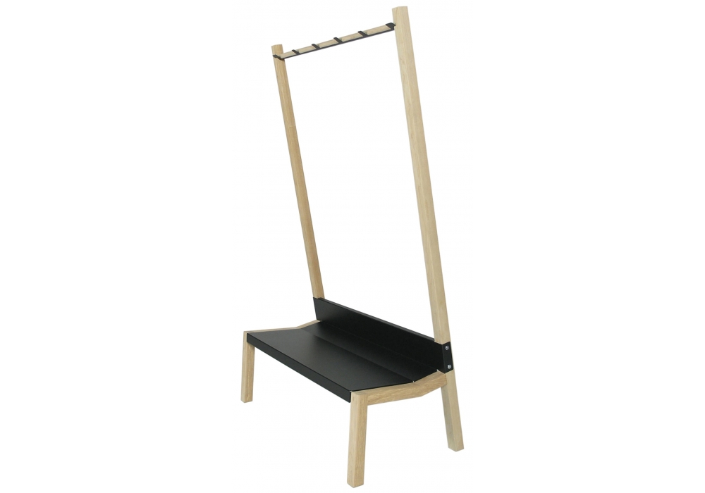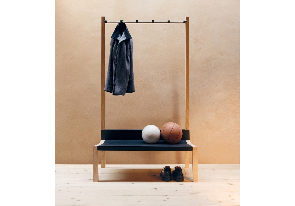 Yak von Rupert Kopp für Moormann entworfen, ist eine Kleiderablage mit Bank mit Struktur aus Eschenholz und Stahl pulverbeschichtetem Anthrazit für den Sitz. Verfügbar mit oder ohne Sitzkissen aus Wollfilz, naturweiß meliert/anthrazit meliert wendbar.