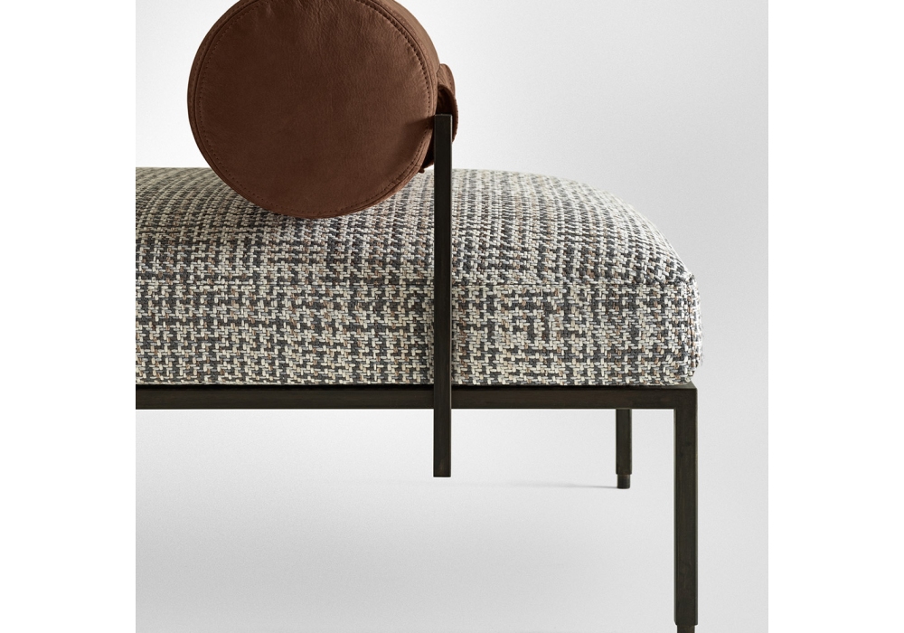 Oly von Massimo Castagna für Gallotti&Radice entworfen, ist ein Sitzbank und Hocker mit Gestell aus Metall schwarz bronziert. Sitz aus unverformbarem Polyurethanschaum mit unterschiedlicher Dichte und Polyesterfaser und Kissenrollen von Rückenlehne mit Stoff oder Leder nach Musterkarte bezogen.