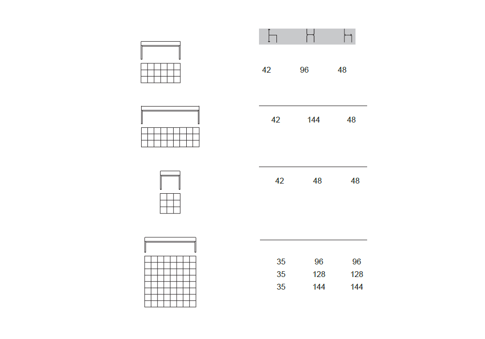 | Abmessungen | 96 x 48 x H 42 cm; 144 x 48 x 42 cm; 96 x 96 x H 35 cm; 128 x 128 x H 35; 144 x 144 x H 35 cm; 48 x 48 x H 42 cm. |