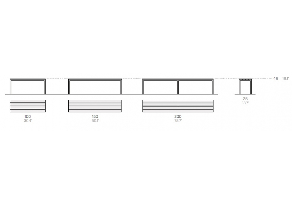 | Abmessungen | • 100 x 35 x H 44 cm; • 150 x 35 x H 44 cm; • 200 x 35 x H 44 cm; • 100 x 35 x H 46 cm; • 150 x 35 x H 46 cm; • 200 x 35 x H 46 cm; • 100 x 38 x H 183 cm; • 150 x 38 x H 183 cm; • 200 x 38 x H 183 cm |