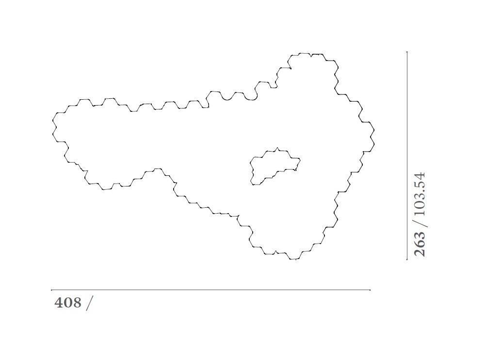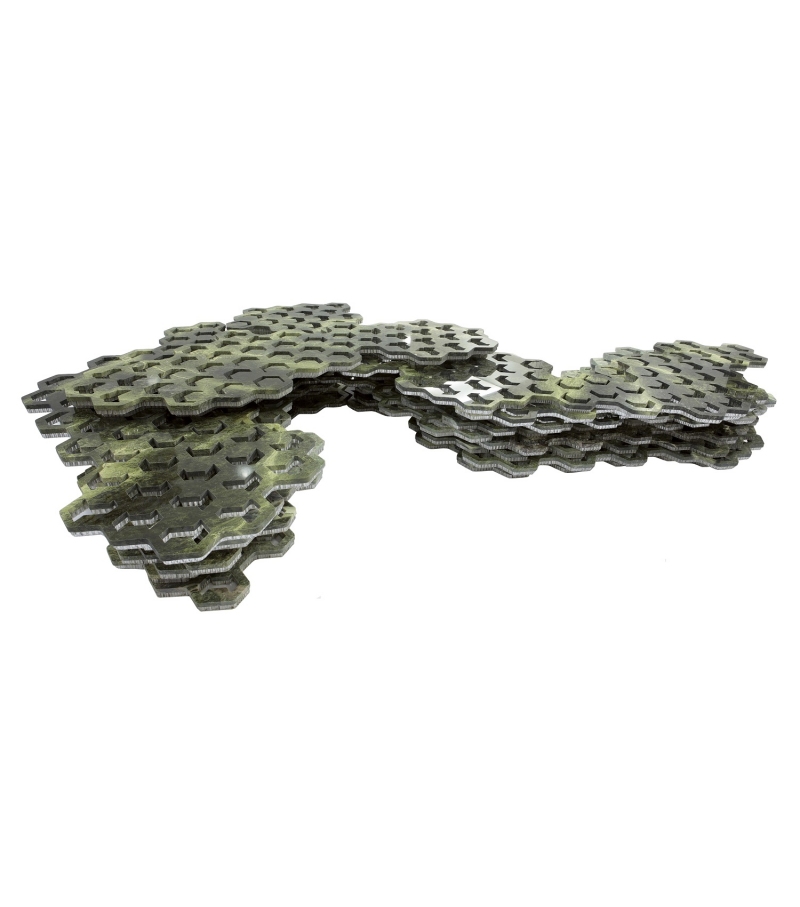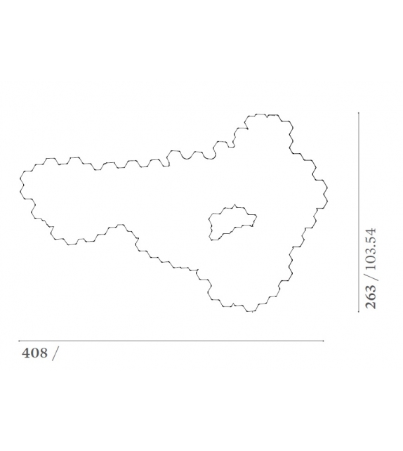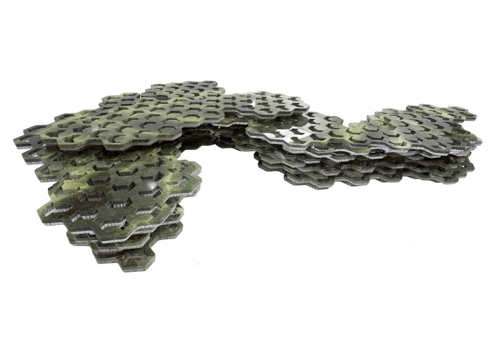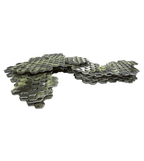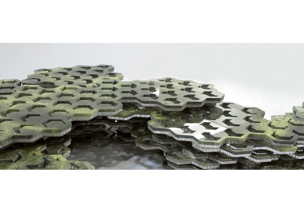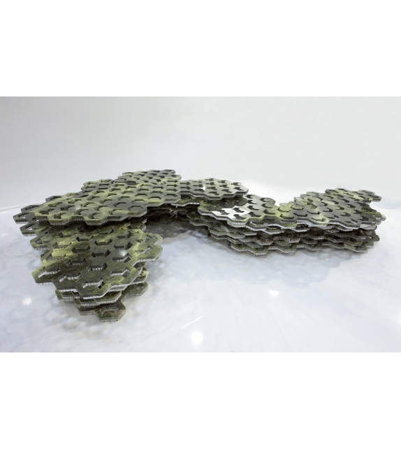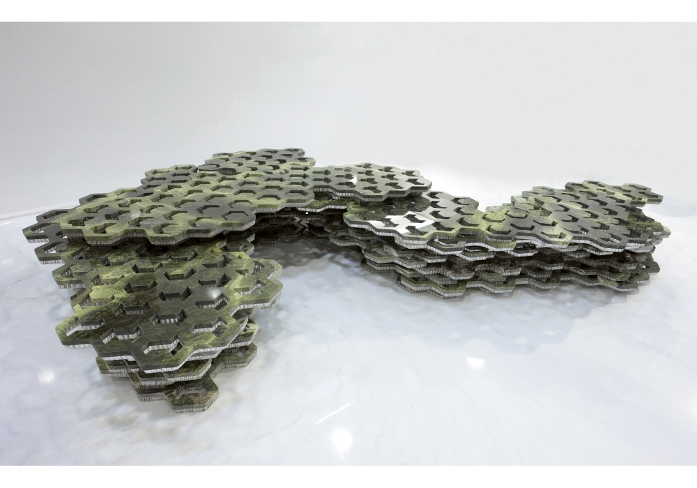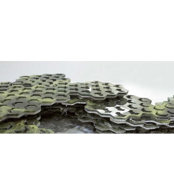 Algae von Patricia Urquiola für Budri entworfen, ist eine riesige Bank von 40 Quadratmetern mit Bienenstöcken, die in grünem Bowenit eingelegt sind und auf mehreren Ebenen übereinander liegen.