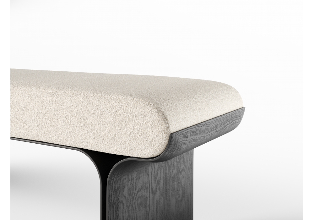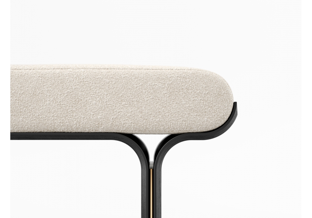 Stami von Studiopepe für Gallotti&Radice entworfen, ist eine Sitzbank mit Gestell aus Eschenholz gebogen schwarz offenporig lackiert und Details aus Messing poliert. Kissensitz aus Polyurethanschaum mit Stoff oder Leder bezogen.