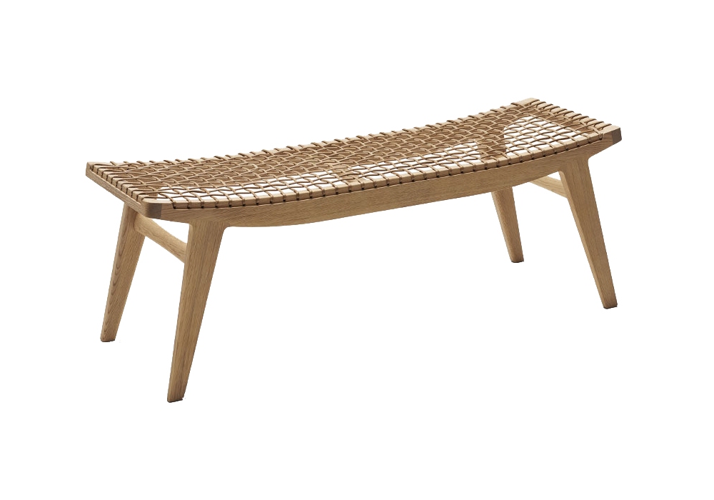 Klismos von Antonio Citterio für Knoll entworfen, ist eine Bank mit Gestell aus natürlicher oder schwarzer Eiche. Der Sitz besteht aus natürlichem Baumwollseil, das auf einer Eichenholzstruktur gewebt ist. Das Kissen ist optional, in naturfarbenem Leder und in schwarzem Leder.
