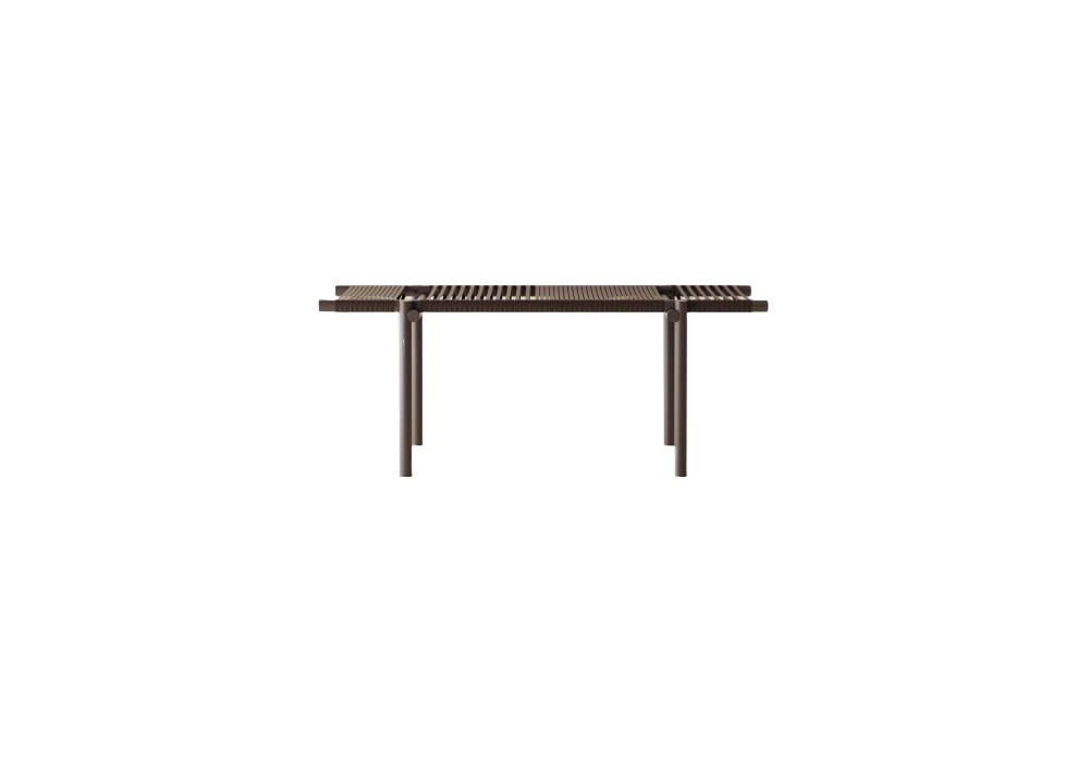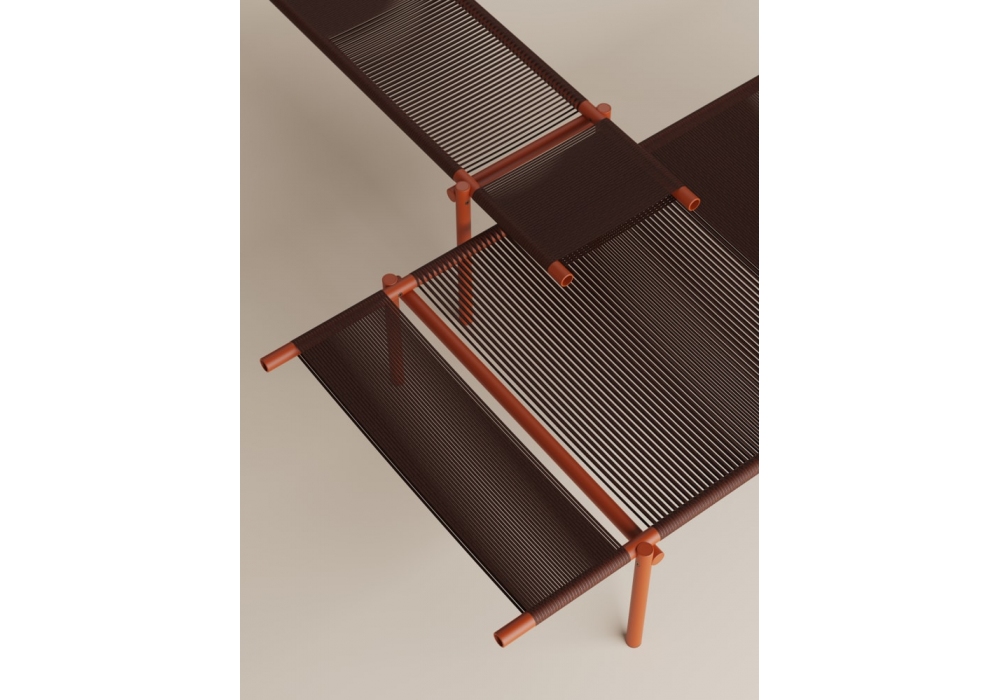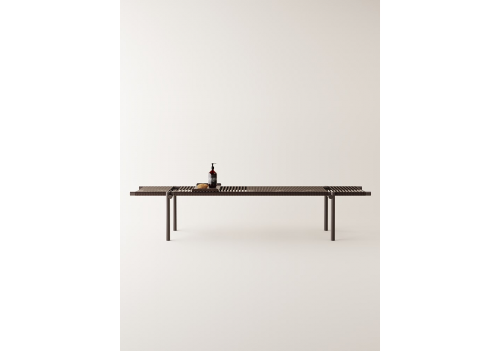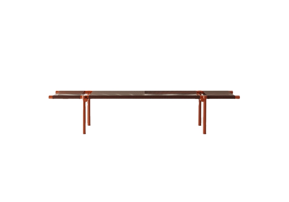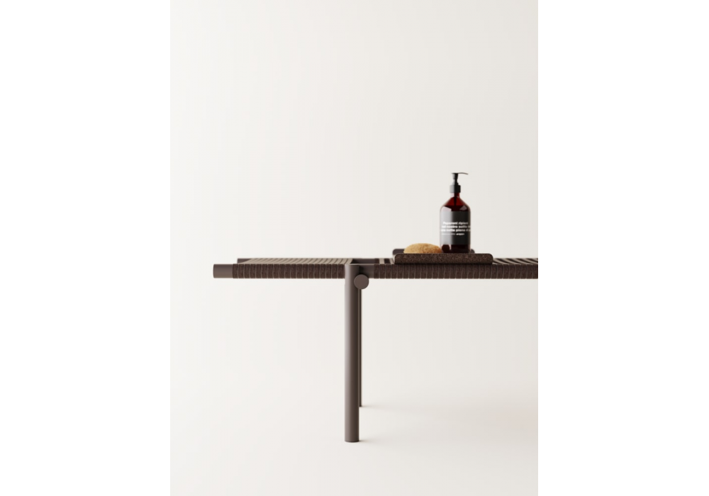 Rendez-vous von Marco Carini für Agape entworfen, ist eine Bank mit einem Gestell aus lackiertem Aluminium. Die Auflageflächen bestehen aus gerösteten Korkstreifen, mit einem technischen Kern aus handgewebtem Nylon. Als Zubehör können Aluminiumtabletts hinzugefügt werden, die im gleichen Finish wie das Gestell lackiert sind.