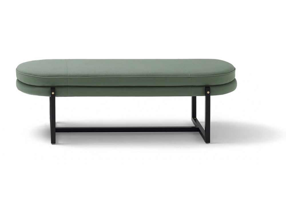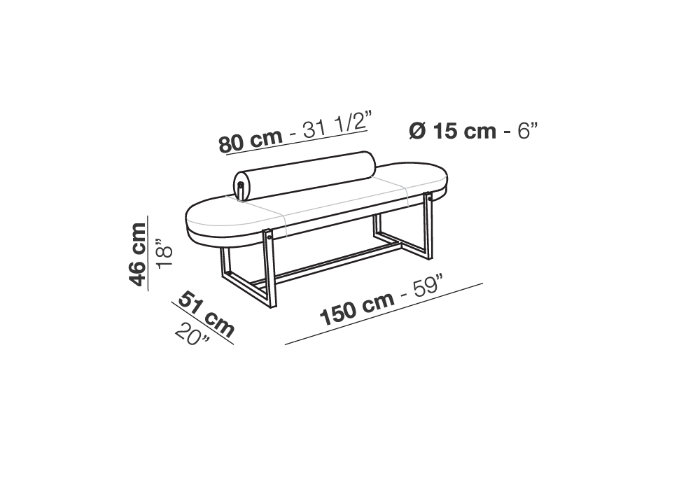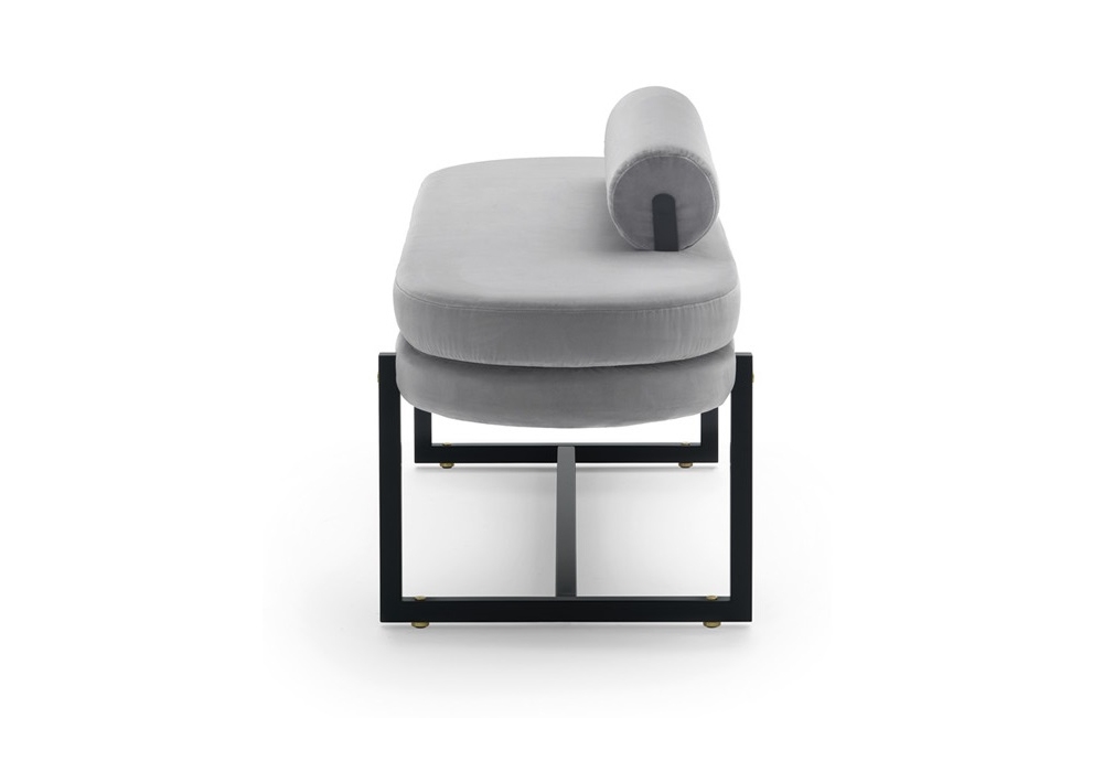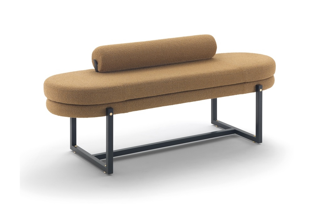 Sigmund von Studio Asai für Arflex entworfen, ist eine Bank mit Metallrahmen, Polyurethankissen und Sitz. Schwarz lackierte Metallbasis, satinierte Messingschrauben und satinierte Messingfüße mit schwarzem Gummi. Abnehmbarer Stoff- oder nicht abnehmbarer Lederbezug. Optionales Rollkissen.
