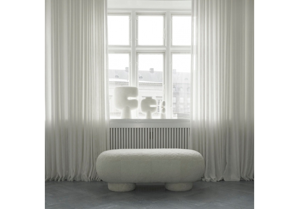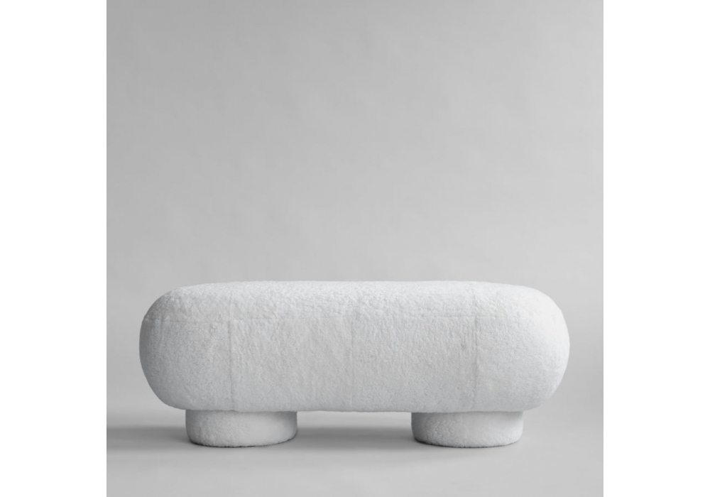 Big Foot von Kristian Sofus Hansen & Tommy Hyldahl für 101 Copenhagen entworfen, ist eine Bank, die sich durch zwei zylinderförmige Beine und einen weichen Sitz auszeichnet. Vollständig mit weißem Schaffell gefüttert.