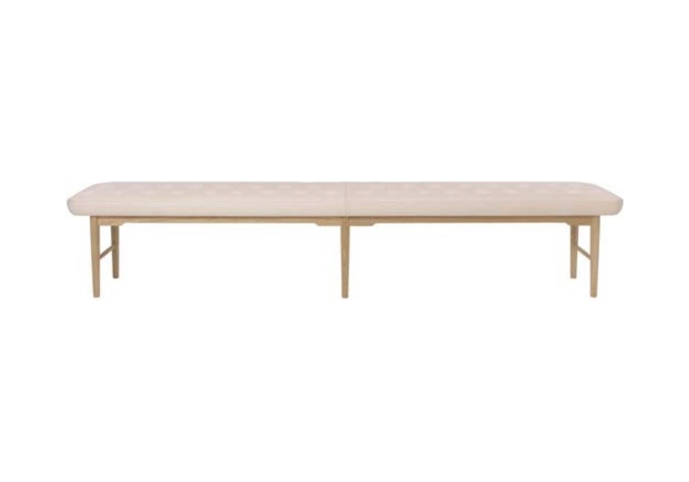 VLA75 Foyer von Vilhelm Lauritzen für Carl Hansen & Søn entworfen, ist eine Bank aus mit Seife oder Öl behandelter massiver Eiche. Das Sitzkissen ist mit Leder in verschiedenen Ausführungen bezogen und mit Knöpfen versehen.
