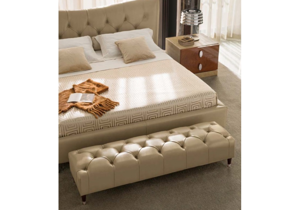 Elvira von Opera Contemporary entworfen, ist eine Bank mit einer inneren Struktur aus Pappelholz, Füßen aus Eschenholz mit Metallspitzen und einer Bezug aus Stoff oder Leder.