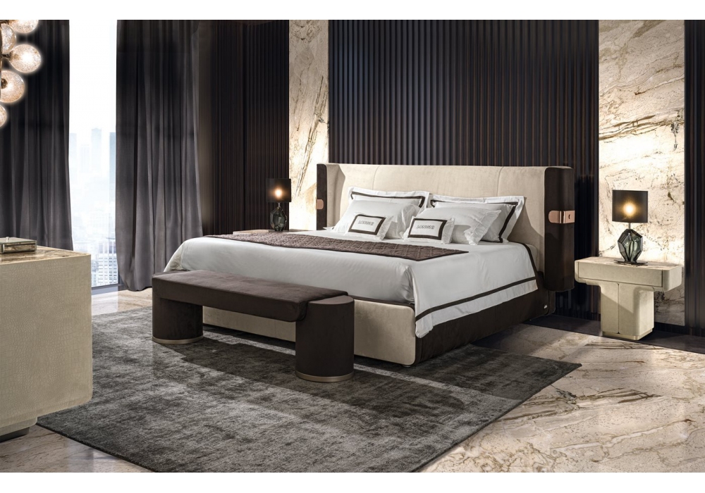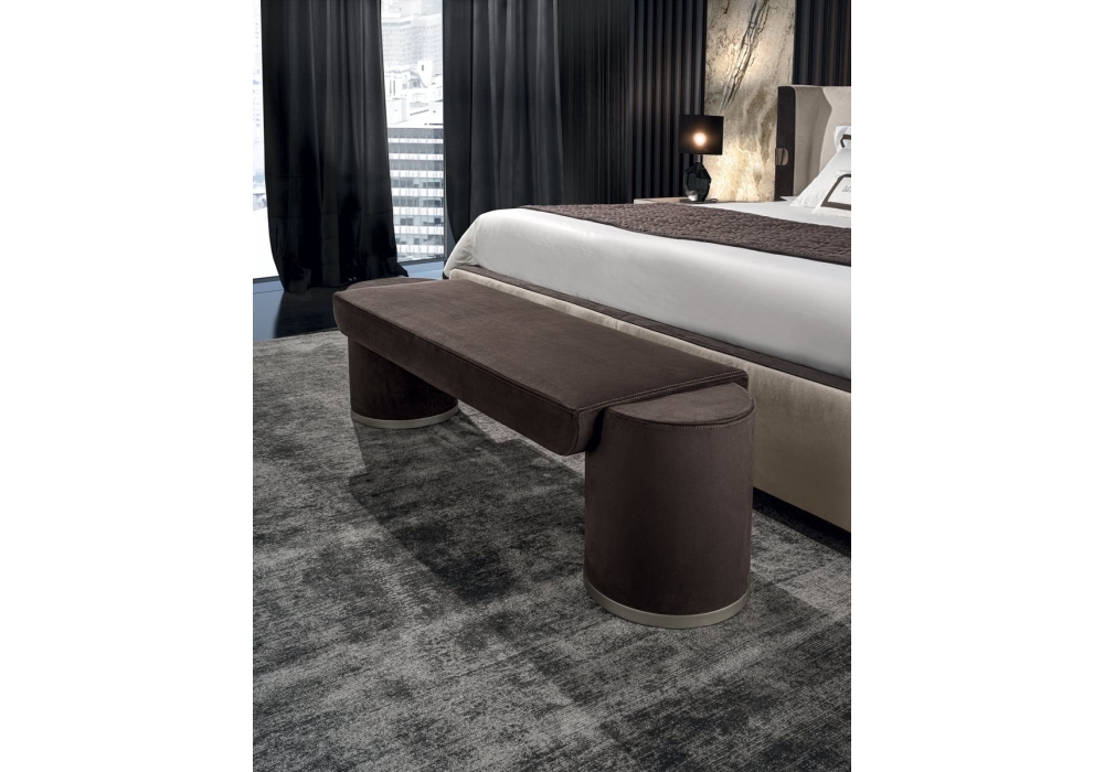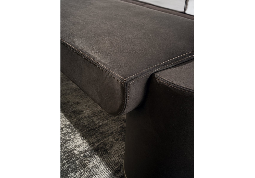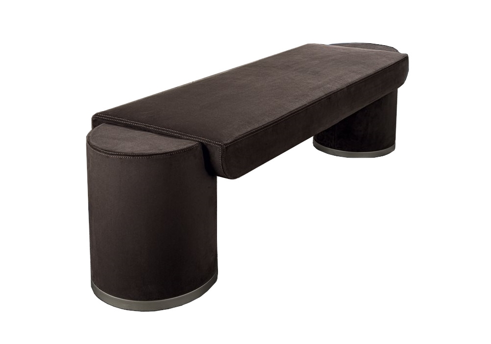 Mi von Ben Wu für Longhi entworfen, ist eine Bank mit Holzstruktur, die mit mittelfestem Polyurethanschaum überzogen ist. In der Basis befindet sich ein Ring aus glänzendem oder mattem Metall. Bezug aus nicht abnehmbarem Stoff oder Leder.