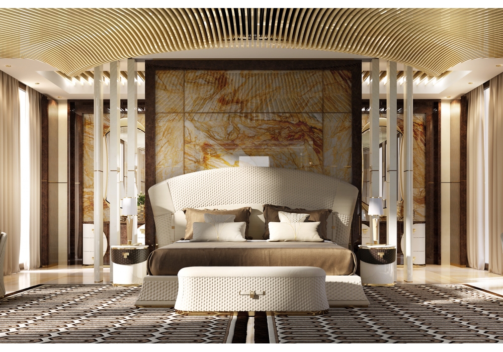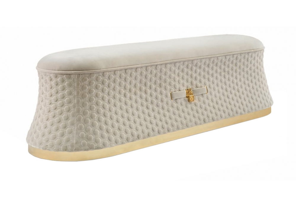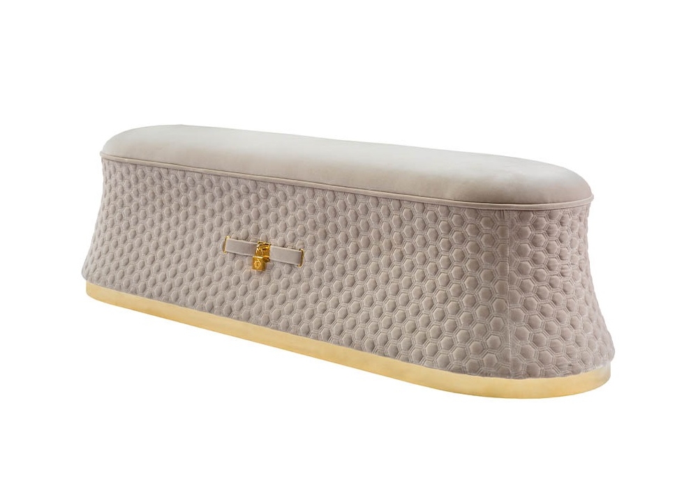 Vogue von Andrea Bonini für Turri entworfen, ist eine Bank mit Struktur aus Sperrholz und Massivholz mit Polsterung aus Polyurethanschaum. Bezug aus nicht abnehmbarem Stoff oder Leder mit sechseckiger Stickerei auf der Struktur. Metallsockel in Gold-Finish.