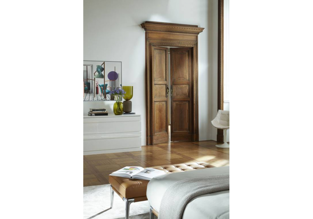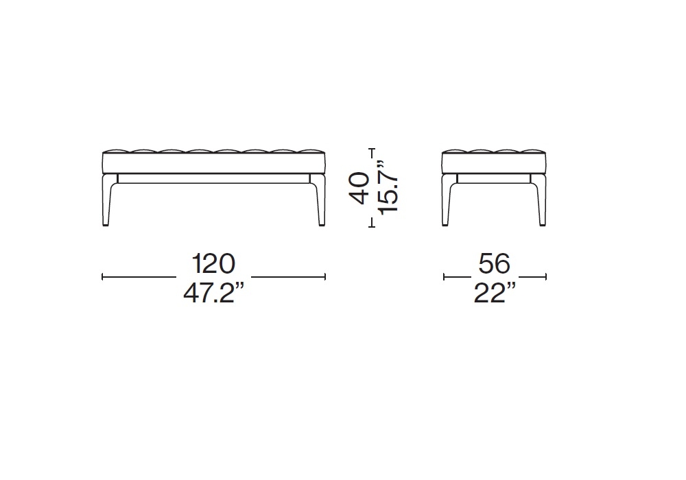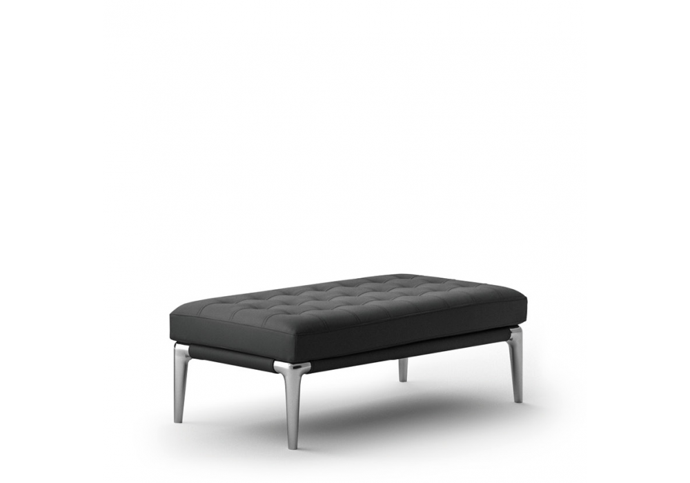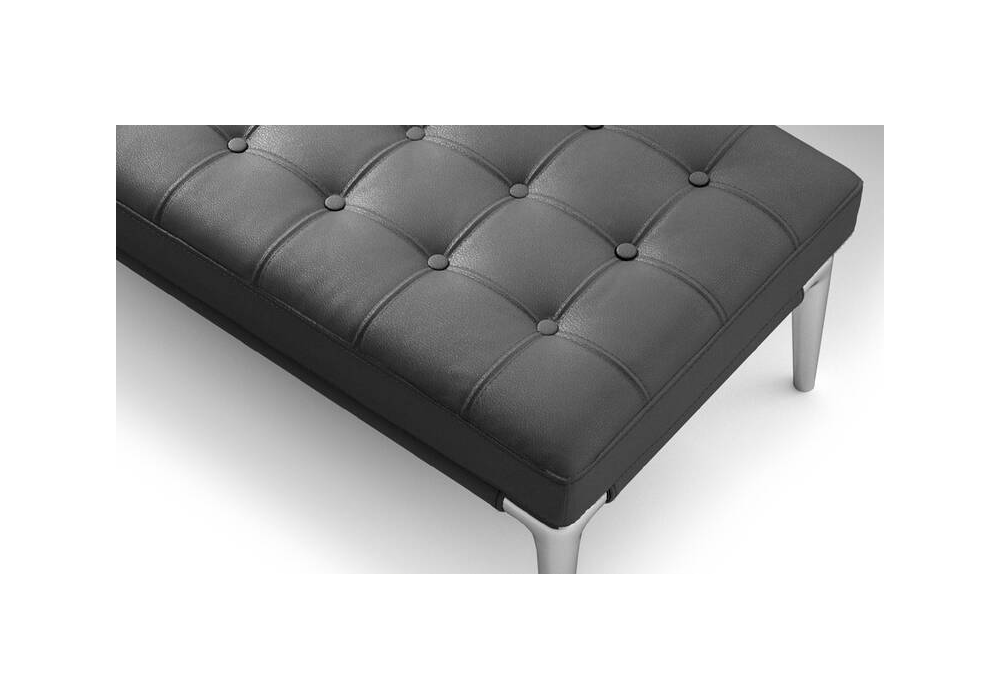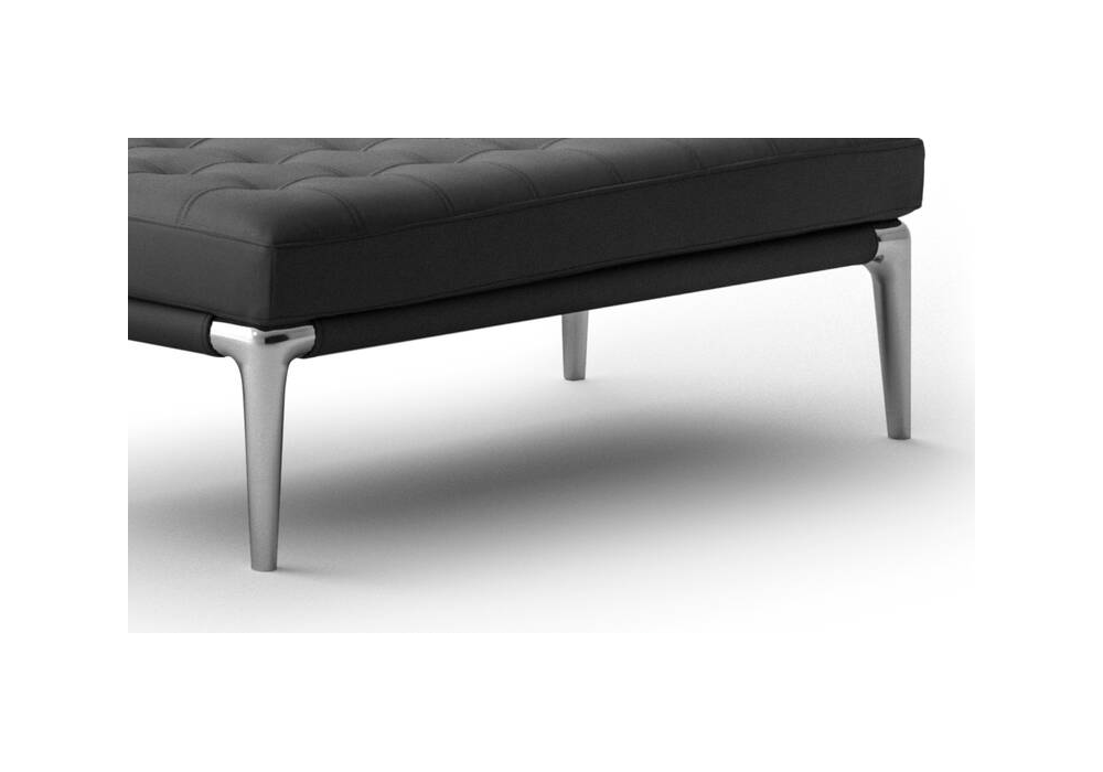 L26 Volage von Philippe Starck für Cassina entworfen, ist eine Bank mit Struktur aus poliertem Aluminium und Capitonné-Bezug aus Stoff oder Leder.