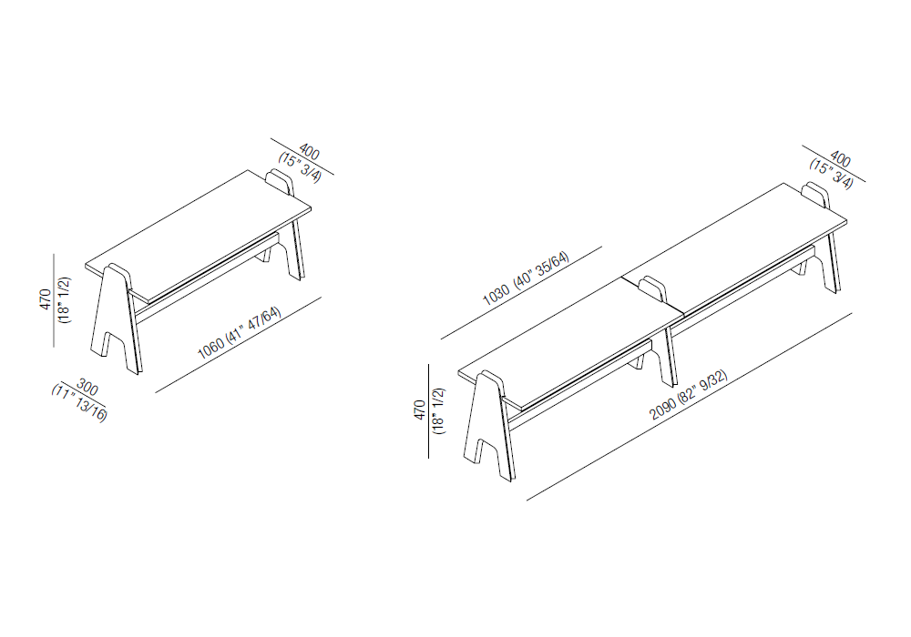 | Abmessungen | 106 x 40 x H 47 cm; 209 x 40 x H 47 cm. |