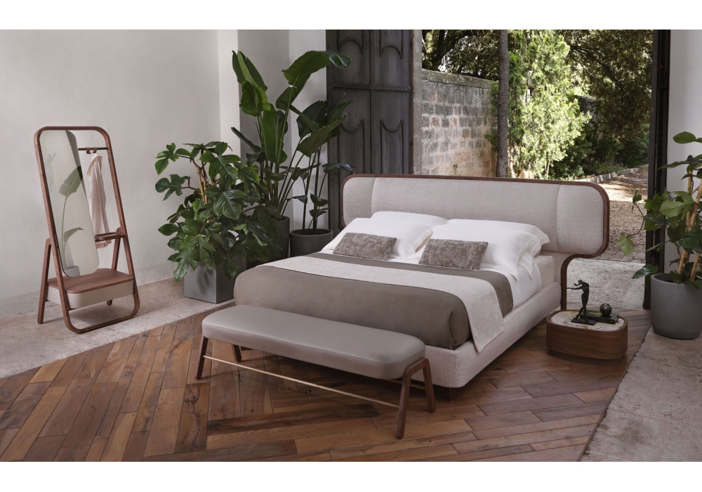 Tako von Setsu & Shinobu Ito + Leonardo Mercurio für Conte Casa entworfen, ist eine Bank mit Stoff- oder Lederpolsterung, Holzstruktur und Metalldetails.