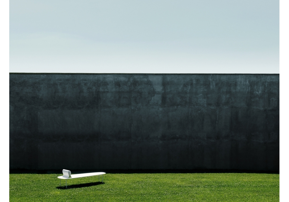 Softer Than Steel 687 von Nendo für Desalto entworfen, ist eine Bank aus Blech mit gebogener Rückenlehne und Beinen aus Stahlstangen. Erhältlich in verschiedenen Ausführungen und Größen.