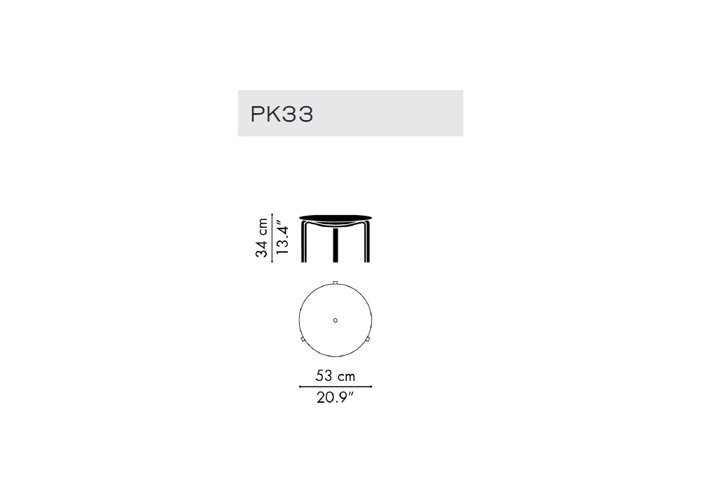 PK33™ von Poul Kjærholm für Fritz Hansen entworfen, ist ein Hocker mit abnehmbarem Sitzkissen aus Leder. Dreibeiniges Gestell aus matt verchromtem Stahl.