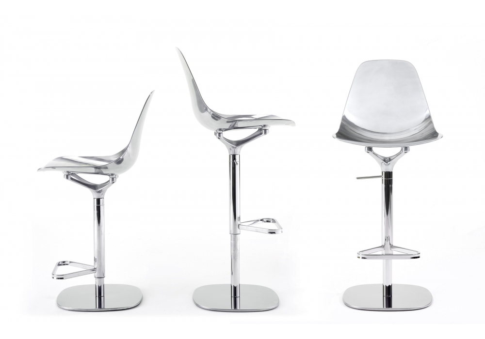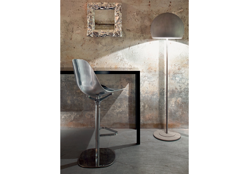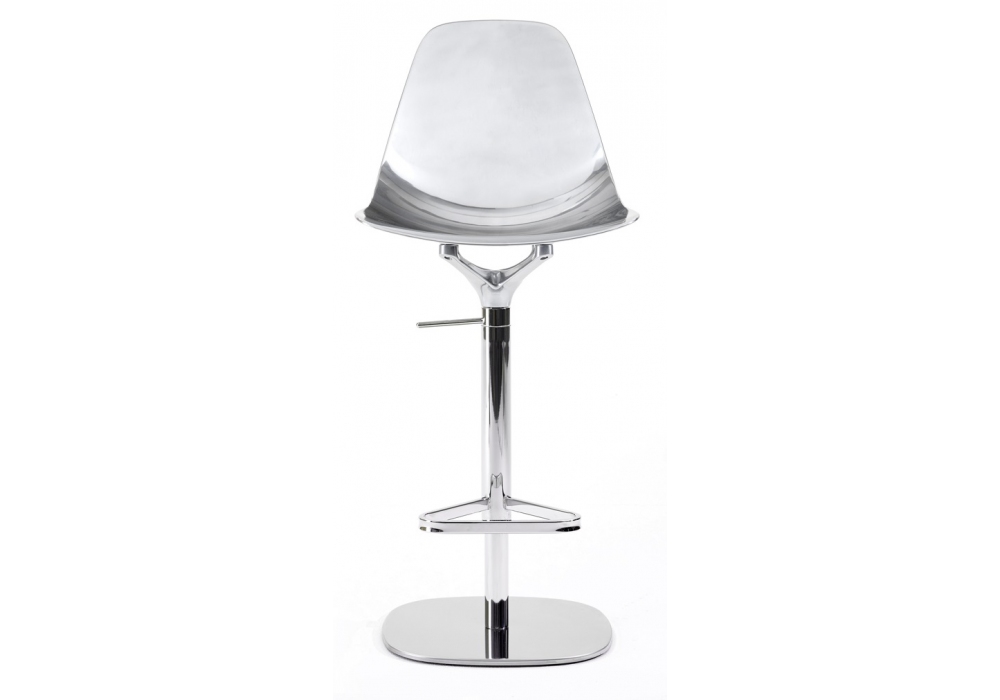 Mammamia Stool von Marcello Ziliani für Opinion Ciatti entworfen, ist ein drehbarer Hocker mit Sitzschale aus Aluminiumdruckguss und Gestell, Basis und Fußstütze aus verchromtem Stahl. Verfügbar in Spiegelaluminium oder in RAL-Farben.