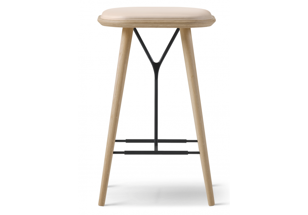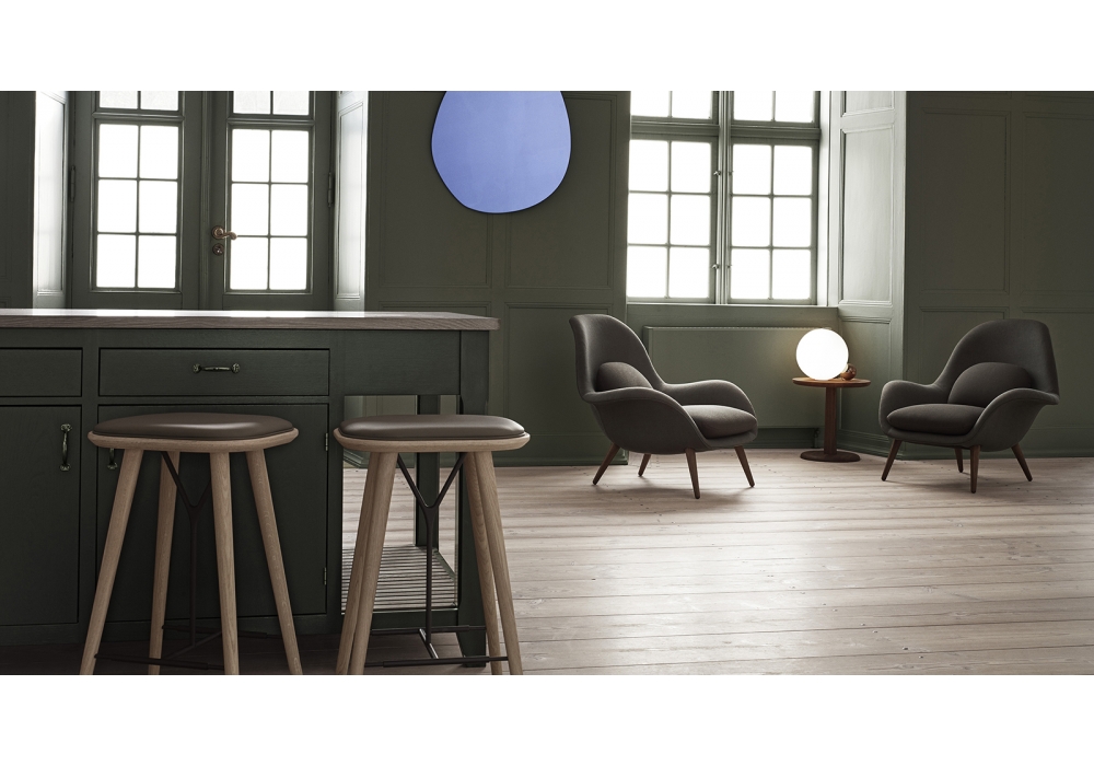 Spine von Space Copenhagen für Fredericia entworfen, ist ein Hocker mit Beinen aus massiver Eiche oder Esche mit pulverbeschichteter Metallhalterung. Sitzschale aus Sperrholz mit Kern aus Buche und Platte aus Eichenfurnier. Der Sitz ist mit Schaumstoff gepolstert und mit Stoff oder Leder bezogen.